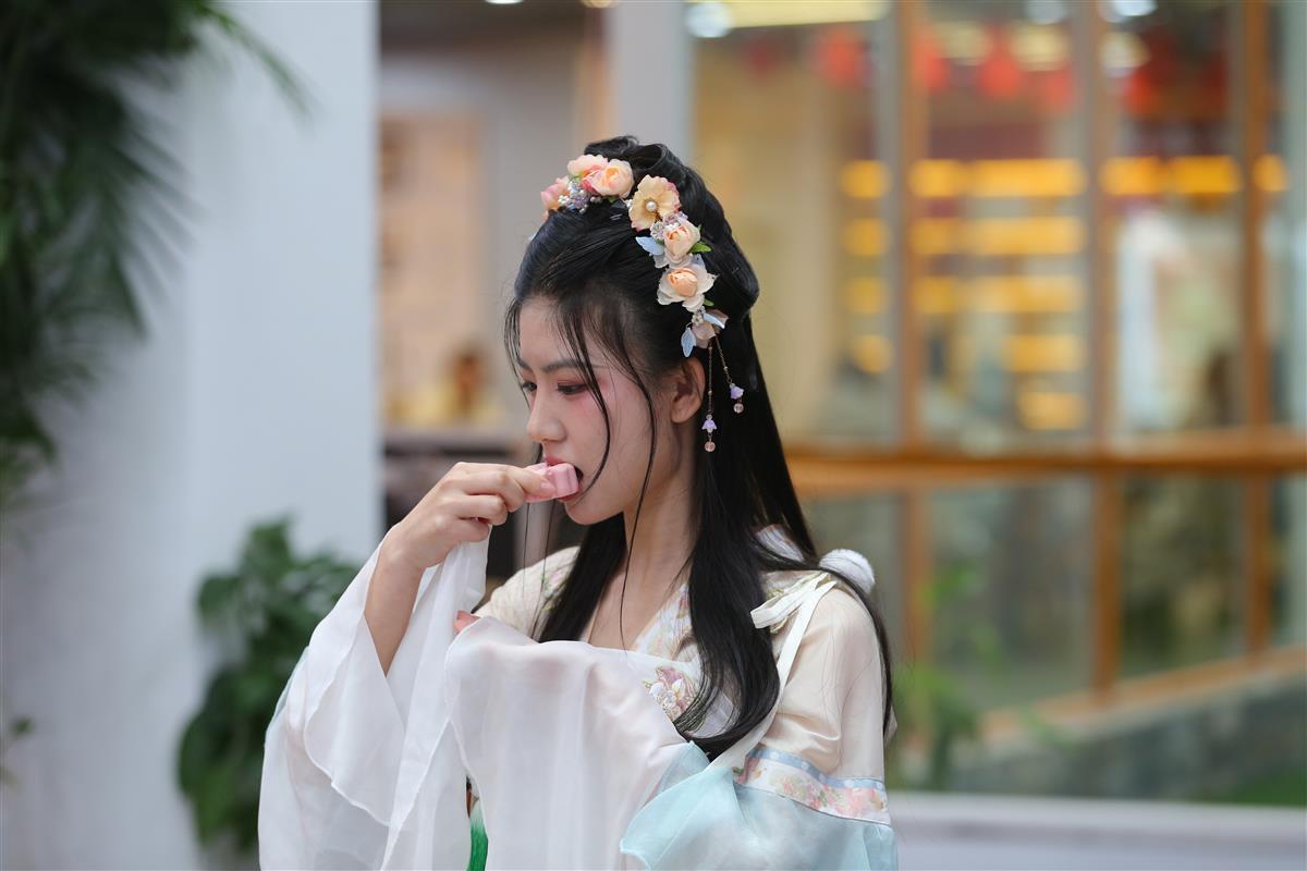 着襦裙、佩披帛、巧上妆、贴花黄……从小就喜欢穿汉服的经济学院大二学生翟雨涵抢到汉服体验名额后,早早地就来到了现场梳妆打扮。妆造结束后,翟雨涵边拍照边说:“汉服不仅体现着中国人对服饰的审美,还蕴藏着华夏传承千年的文化魅力。你看,汉服上常常缝制牡丹、梅花、龙凤、喜鹊等图案,展现出生动自然、精美雅致的东方服饰风格,也是人们对美好生活的向往和希冀。”翠袖红裙、宽袍广袖、青衫白褂。越罗衫袂迎春风,玉刻麒麟腰带红。同学们身着各式汉服,或撑一把油纸伞,或举着团扇,在校园大道、图书馆、鹤鸣湖畔等处翩然走过,成为校园一道独特的风景,吸引了大批师生驻足观看。