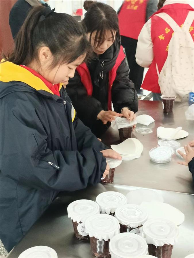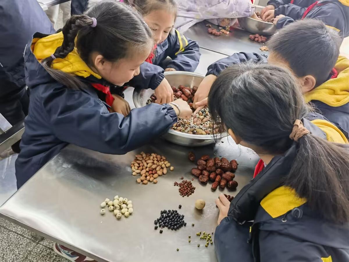 薛峰小学全体学生每人从家中带一把煮粥食材,当同学们将红枣、红豆、黑豆、糯米、黑米、桂圆、花生、莲子、薏仁米倒入桶中时,他们的心里除了兴奋,还有期待。