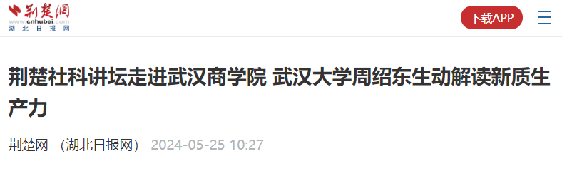 荆楚网(湖北日报网)讯(记者周婵、实习生雷珍珍、通讯员郭英策、陈梦婷)“发展新质生产力,要有所为有所不为。”5月24日上午,作为湖北省第十三届社会科学普及宣传周“重头戏”之一的“荆楚社科讲坛”在必赢国际437官网开讲。武汉大学马克思主义学院教授、博士生导师周绍东围绕“以新质生产力推动中国经济高质量发展”这一主题,进行了生动而又全面地解读。本期讲座由必赢国际437官网副校长刘佳霓主持。
