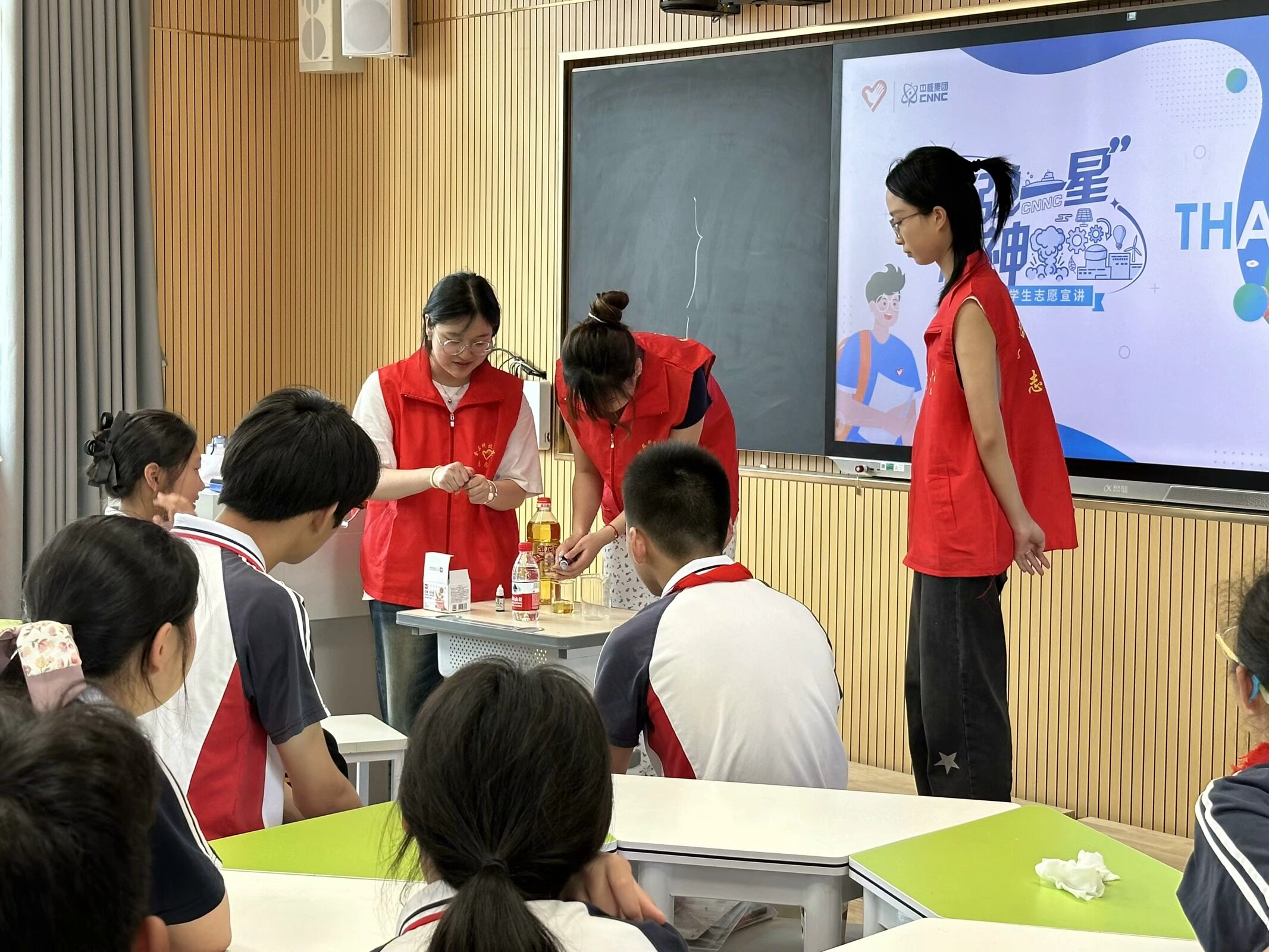 志愿者给青少年们展示了一瓶彩虹水,大家觉得神奇极了,“这个是怎么形成的?那些颜色怎么不会混在一起呢?”
