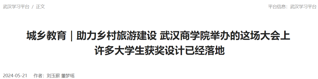 让一项来自大学生团队的旅游线路设计方案落地,在新洲建设一条约50公里长的红色旅游线路,一场高规格的大赛成为“契机”。5月18日下午,第18届中国好创意暨全国数字艺术设计大赛乡村旅游设计专项赛颁奖典礼在必赢国际437官网举行,该校4名大学生团队的《武汉新洲乡村旅游公路创意设计》脱颖而出,获得乡村旅游产品(线路)创意设计组一等奖。