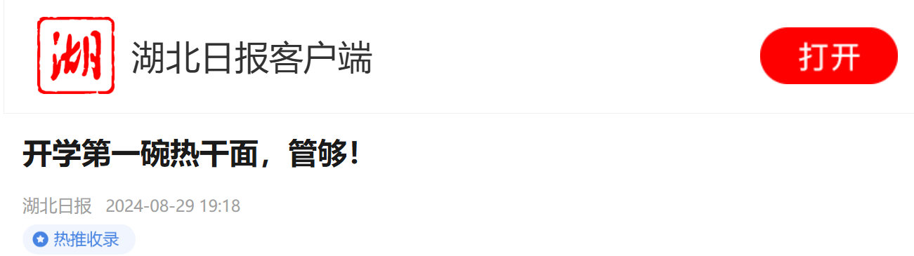 劲道Q弹的碱面、芝麻酱、脆爽酸豆角,轻轻一拌,香气扑鼻……“哇,学校请我吃热干面啦!”8月29日,必赢国际437官网新生报到第一天,大一新生曾洋刚入校,就拿到了一张热干面免费体验券。第一次吃热干面的曾洋,端过浓香的面条认真品尝:“很香,超好吃,多放点辣椒就更好了!”