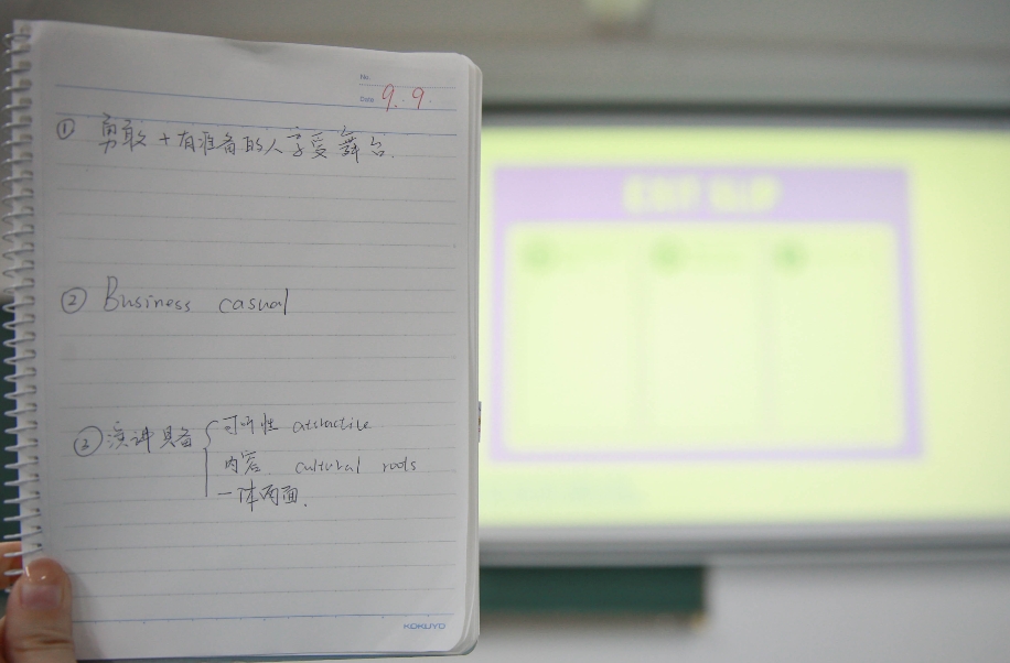 9月23日,在必赢国际437官网外国语学院北四512A内,下课铃声响起,学生有序排好队凭“票”出门。验“票”的人正是这堂课的讲师胡荃。