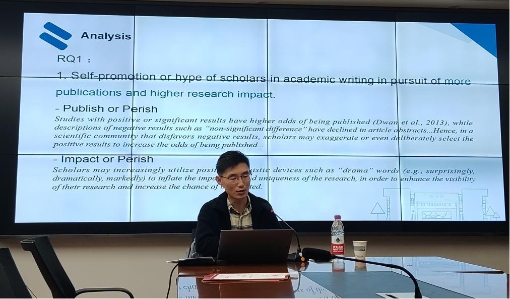 10月22日下午,华中科技大学博士生导师朱浩然副教授应邀在外国语学院北四-416B会议室做了题为“情感分析在学术英语研究中的应用”的学术讲座,促进了学院教师学术水平与科研能力提升。讲座由外国语学院副院长忻竞主持,全体教师参加。