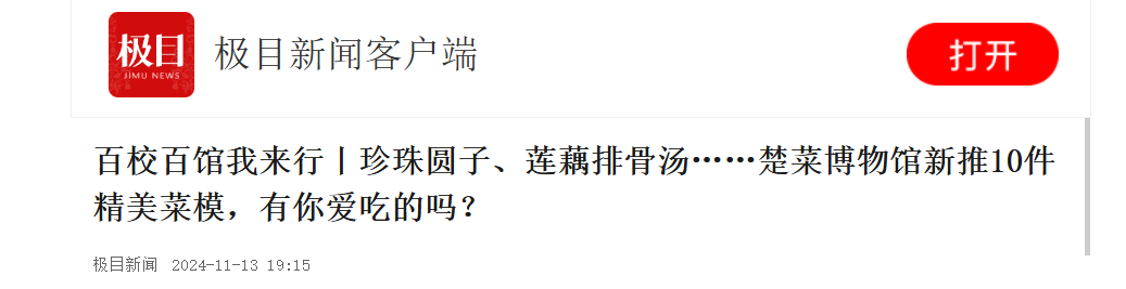 楚菜博物馆作为湖北唯一的烹饪饮食文化博物馆,自2017年建成以来,一直致力于展示楚菜的发展历程和省内主要饮食风味流派的特色。目前,馆藏菜模已达300多件,标本100多件,烹饪文物80余件。2024年,博物馆还积极拓展场馆文化功能,定期邀请中国烹饪大师举办非遗糕饼文化、楚菜烹饪制作、茶文化主题等系列课程,深受市民及大学生的喜爱。