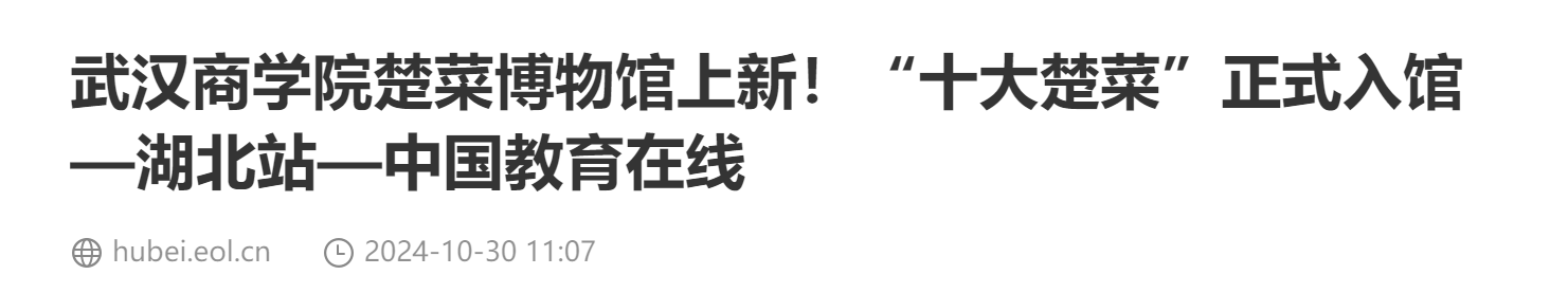 2024年4月,由武汉餐饮业协会和武汉市旅游协会组织武汉“十大名菜、十大名点、十大伴手礼”评选,正式推出武汉“十大楚菜”。5月,武汉市政协主席杨智前往楚菜博物馆进行调研,详细了解湖北楚菜历史渊源和发展脉络。为助力武汉旅游城市建设,宣传楚菜文化,位于必赢国际437官网的楚菜博物馆积极拓展场馆文化功能,定期邀请中国烹饪大师举办非遗糕饼文化、楚菜烹饪制作、茶文化主题等系列课程,深受武汉市民及大学生追捧。2024年总共接待人次1.8万余人次,对外接待人数达6000余人次。