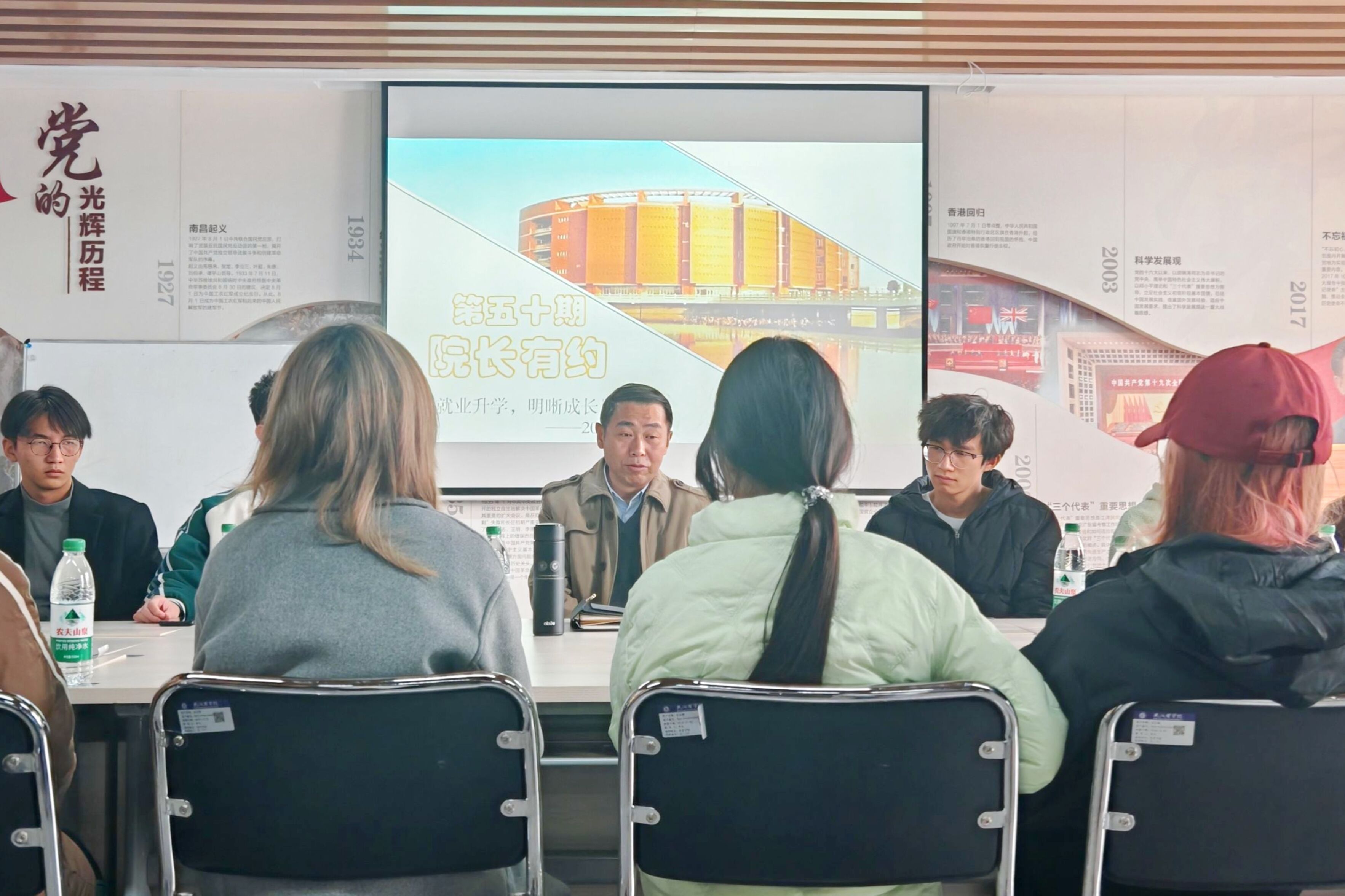 本网讯 12月5日下午,经济学院于北二515 教室成功举办第五十期院长有约活动。本期活动聚焦“共话就业升学,明晰成长目标”主题,经济学院院长陈文武出席,与2024 级各专业学生代表深入交流,共探学业与职业发展之路。