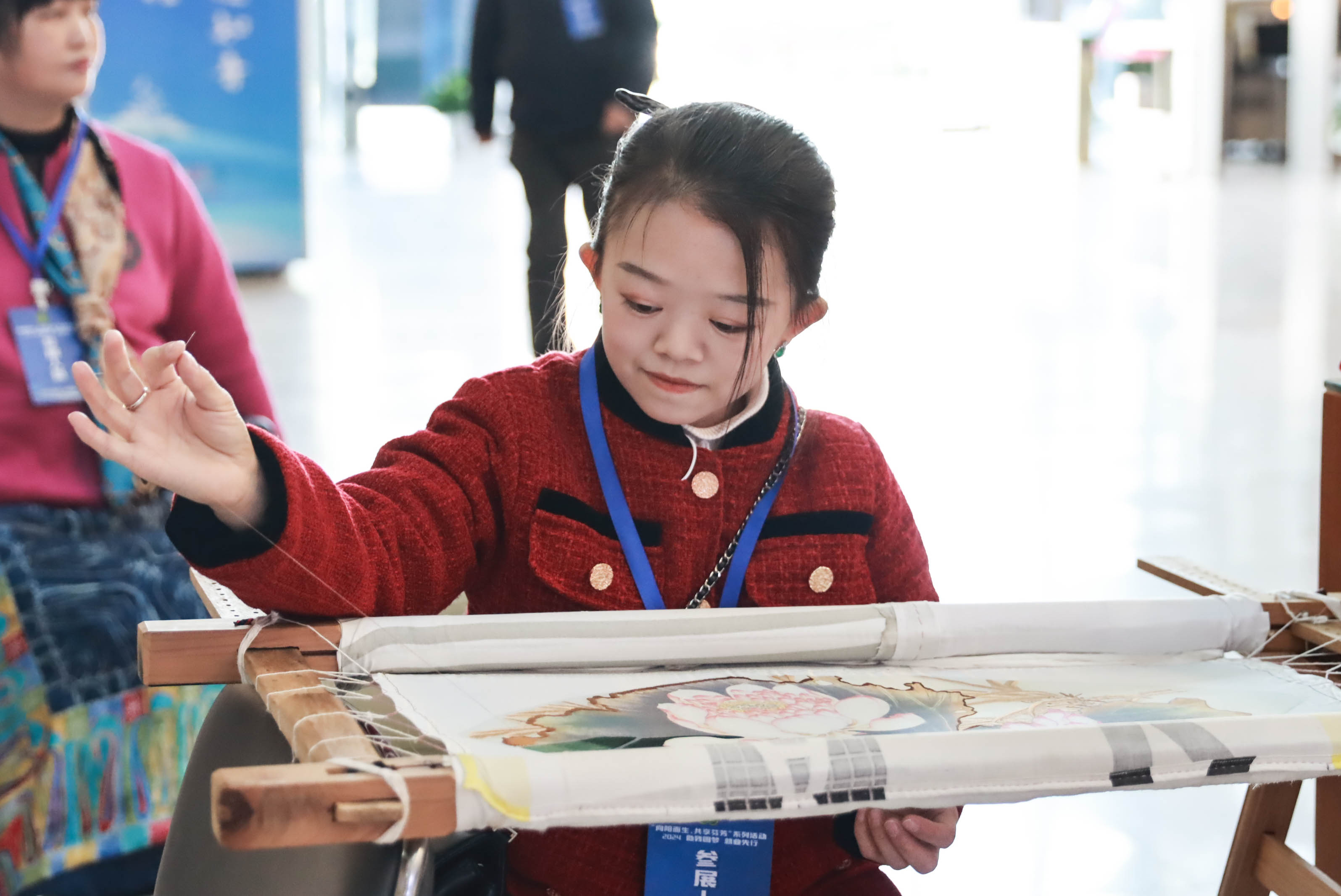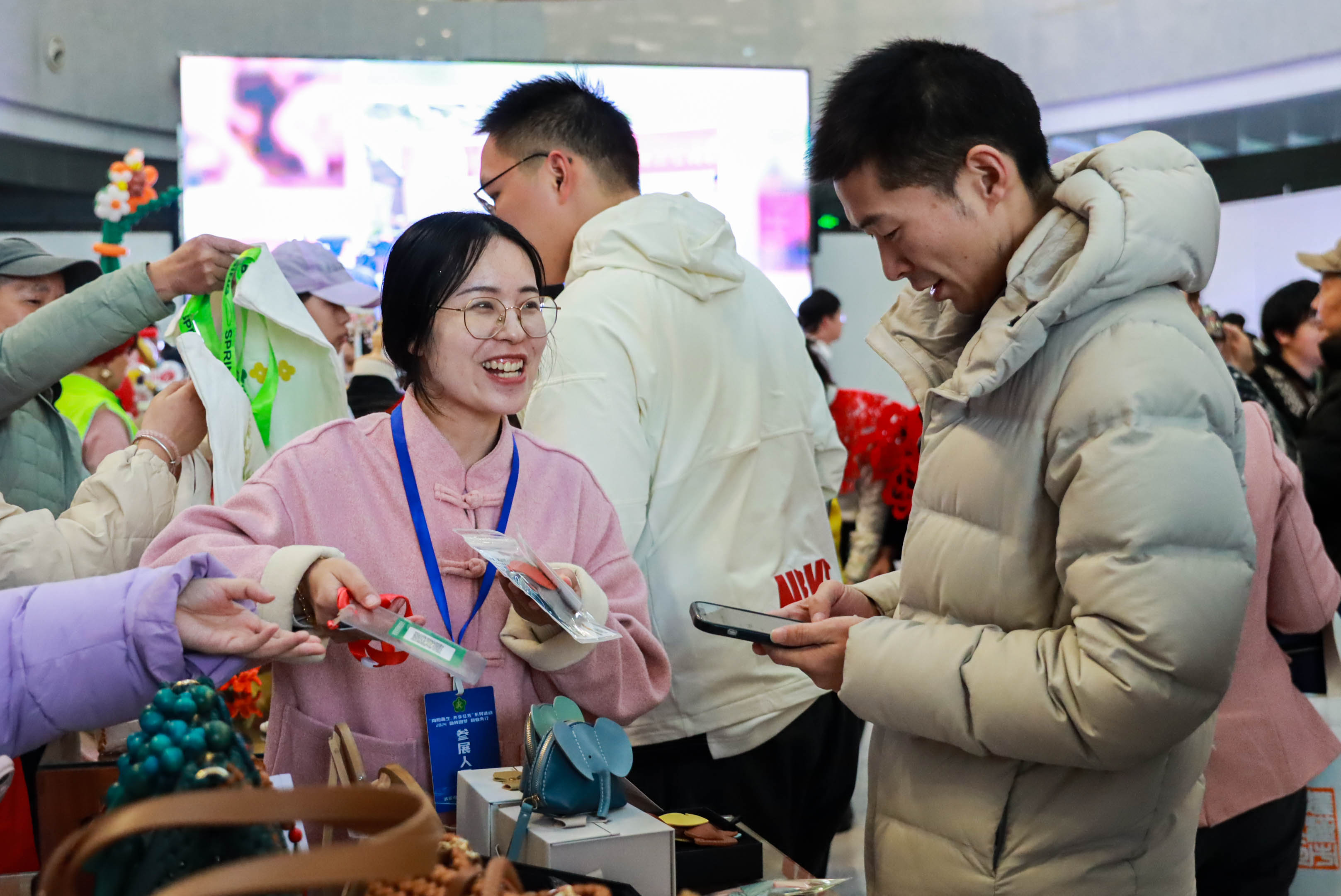 活动现场,志愿者们有的化身“导航”,热心引导残疾人朋友与参会者入场,还耐心帮助残疾人朋友与参会者洽谈;有的化身“布展员”,积极协助布展,帮助残疾人士将他们制作的汉绣、剪纸云肩、艺术气球等精美绝伦的作品摆放在展台上;还有的化身“代言人”,帮助展台人员出售残疾人朋友亲手制作、种植的产品,活动现场欢声笑语,生机盎然。