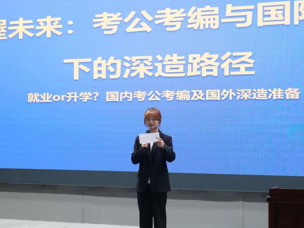 本网讯 12月17日下午,外国语学院在图书馆报告厅举行了以“把握未来:考研、考公、考编与国际视野下的深造路径”为主题的致远讲坛。此次讲座邀请了新东方名师李敏与蔡克奎为学生们深刻剖析当代青年面对考研、考公、考编、留学应当如何合理规划。