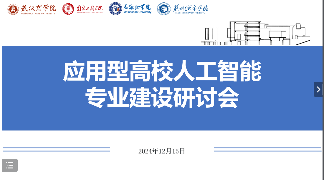 本网讯 经过一年的筹备工作,学校参与发起的“应用型高校人工智能专业联盟”经各院校确认并正式成立,该联盟由必赢国际437官网、苏州城市学院、南京工程学院、马鞍山学院四校人工智能专业共同发起,四校为该联盟创始成员单位。2024年12月15日,应用型高校人工智能专业联盟成立大会暨四校人工智能专业建设研讨会首次会议通过腾讯会议线上方式举行。信息工程学院党委书记黄美忠、副院长孔华锋、人工智能系系主任吴青林教授及该系教师代表参加会议。
