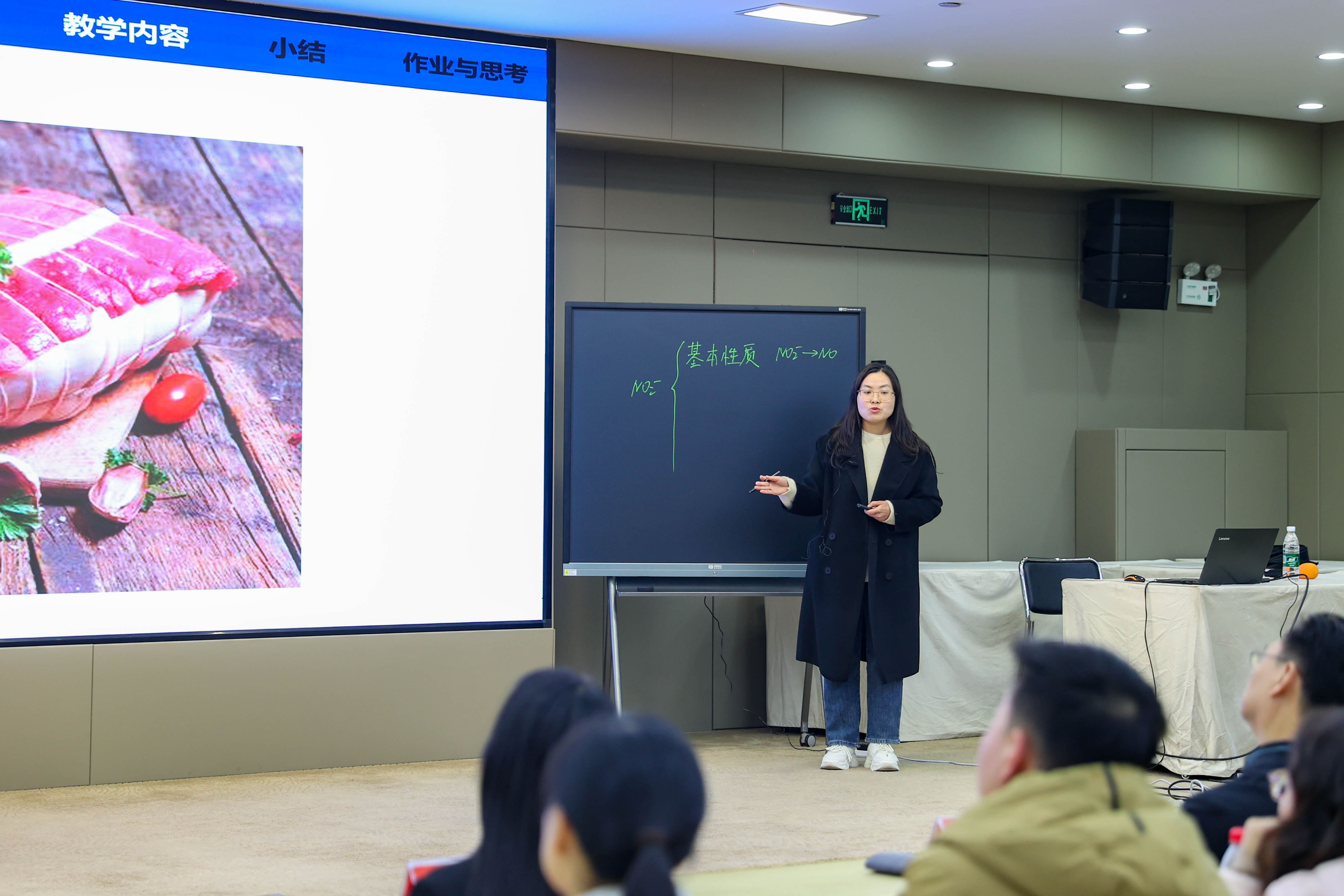 会计学院的杨萍老师围绕商誉项目进行了财务分析课程范例教学,重点探讨了企业并购的质量。课程内容主要包括商誉项目的含义、核算及通过分析并购质量来探讨商誉的规模。食品科技学院的黄晓苹老师以“亚硝酸盐:食品工业中的双刃剑”为主题,从食品添加剂(必修)的基本性质和作用机理两方面讲解了食品色泽改善的内容,帮助学生深入了解亚硝酸盐的应用及其潜在风险,从而更好地掌握食品添加剂的使用和管理。信息工程专业的晏丽霞老师通过高铁的即时速度这一生动实例,引入高等数学中的导数学习,让学生在实际情境中领悟高等数学的魅力与价值。