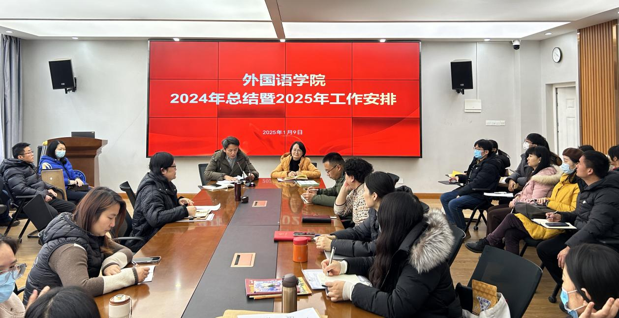 本网讯 1月9日,外国语学院在北四416B召开2024年终总结及2025年工作安排会,李萍院长、忻竞副院长及学院党委副书记尹志洪分别向全院教职工介绍了学院2024年的工作情况,并部署了2025年工作安排。