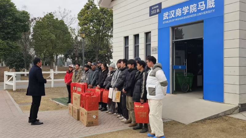 中午12点30分,慰问活动在驭马公园马厩前广场进行。在为每位留校学生送上慰问品后,李院长深情地对大家说:“同学们,你们选择寒假留校照料马匹,牺牲了与家人团聚的机会,体现了你们热爱学校、热爱专业、热爱马匹的情怀。为了这份热爱,学院将做你们坚强的后盾。在这个特殊的寒假里,我们希望你们能感受到家的温暖,学院永远是你们最温馨的港湾。”