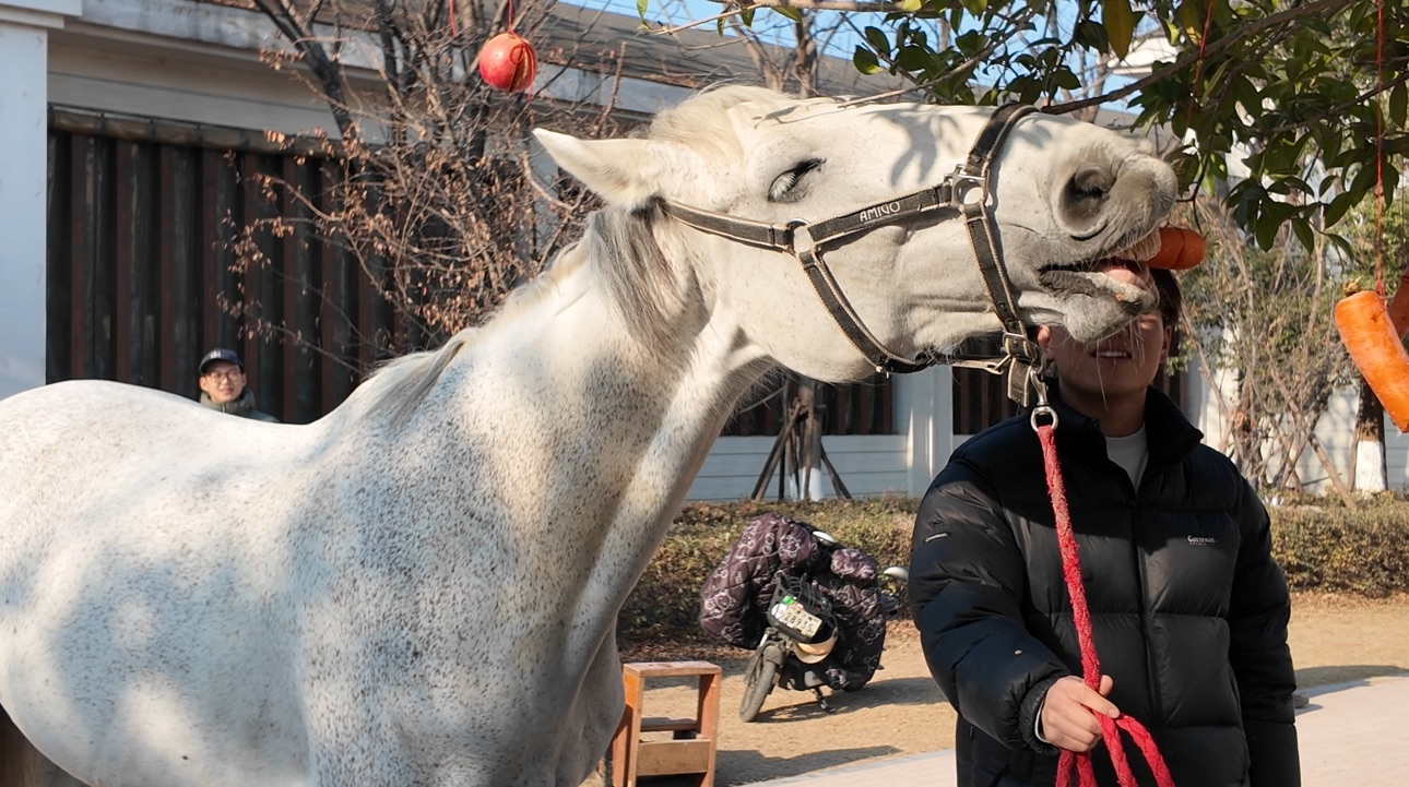 系着红发带,身着赤色鞍,一匹匹马儿在师生的精心打扮下出现在眼前,它们前往挂满苹果和胡萝卜的礼物树,凭借自己的努力在树上“寻宝”,收获自己的新春佳肴。体育学院·国际马术学院教师胡智桐介绍:“苹果寓意平安顺遂,‘福’萝卜则寓意着福气满满。这些都是马儿比较喜欢的食物,在新春佳节,希望通过这种方式祝福同学们和所有马儿平平安安,事事顺心。”