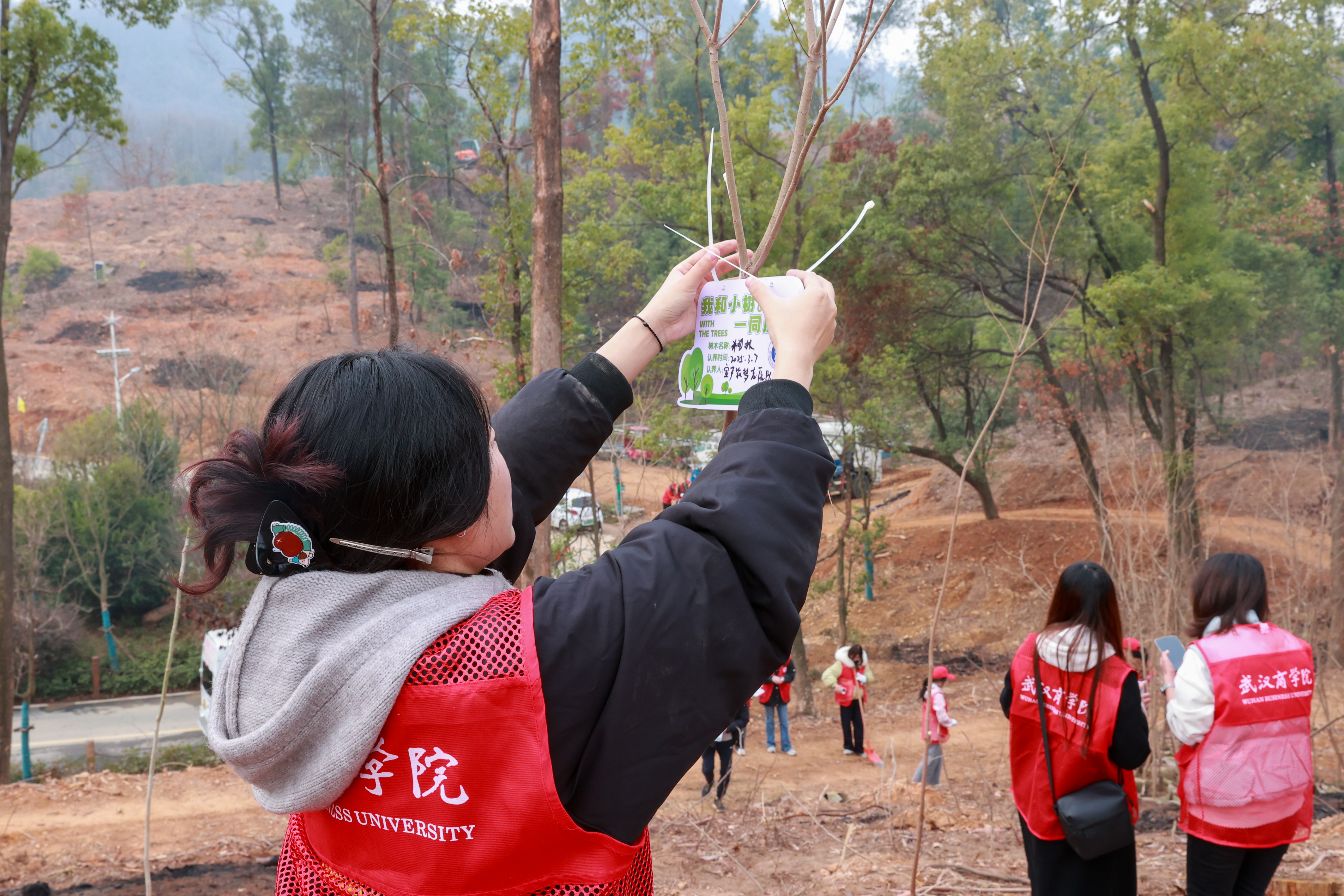 志愿者们为小树挂牌。 许媛、谢欣怡摄