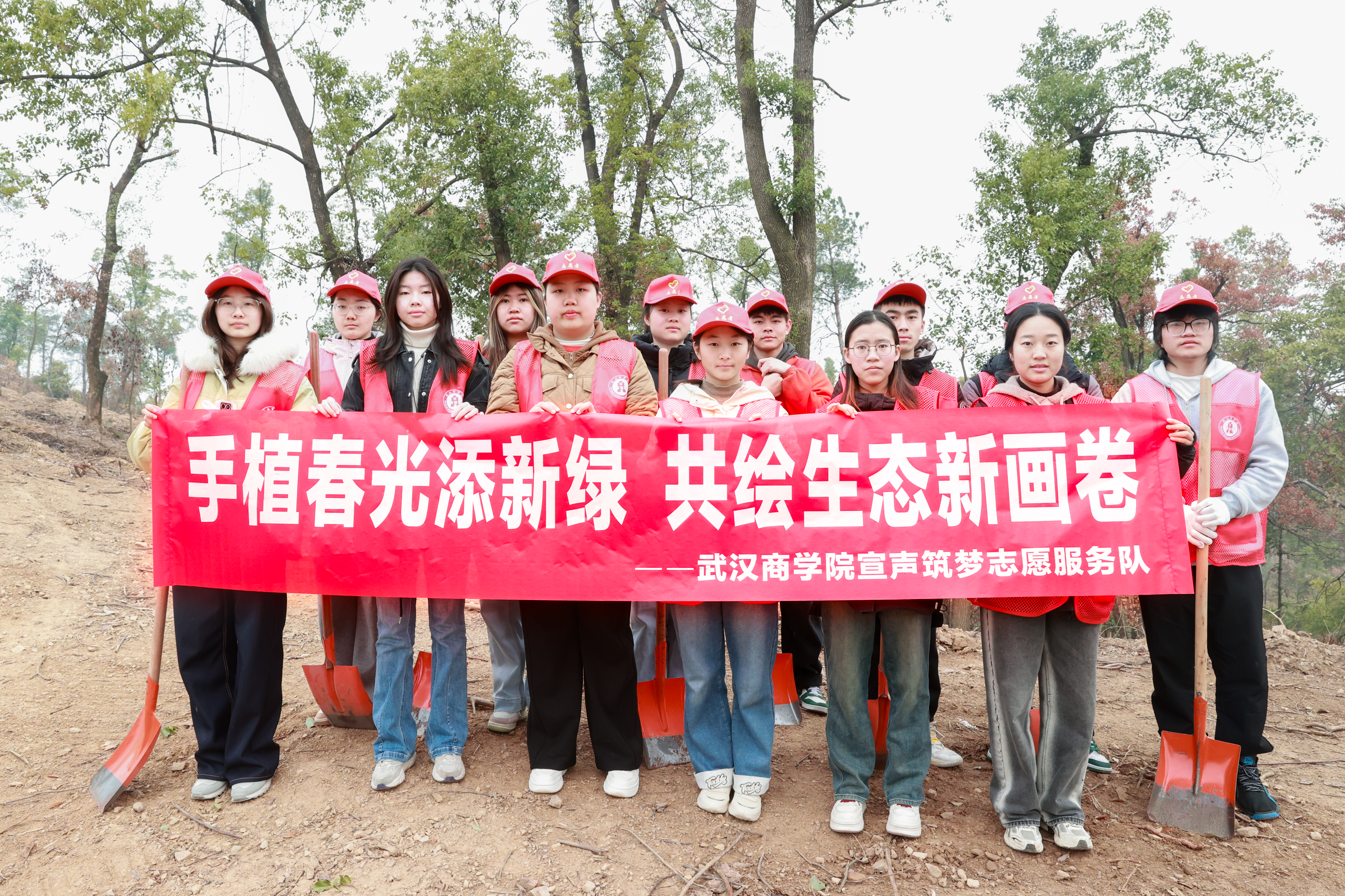 本网讯 3月7日,武汉市蔡甸区玉贤街道陈福分场小山吴家出现了一群“红马甲”,他们手拿铁锹和水桶,在土坡上种下了一棵棵树苗。这是来自必赢官网全媒体中心的16名志愿者开展的“两袋一心”志愿服务,在带队老师张永潮的带领下,用实际行动积极响应武汉市全民义务植树尽责活动。