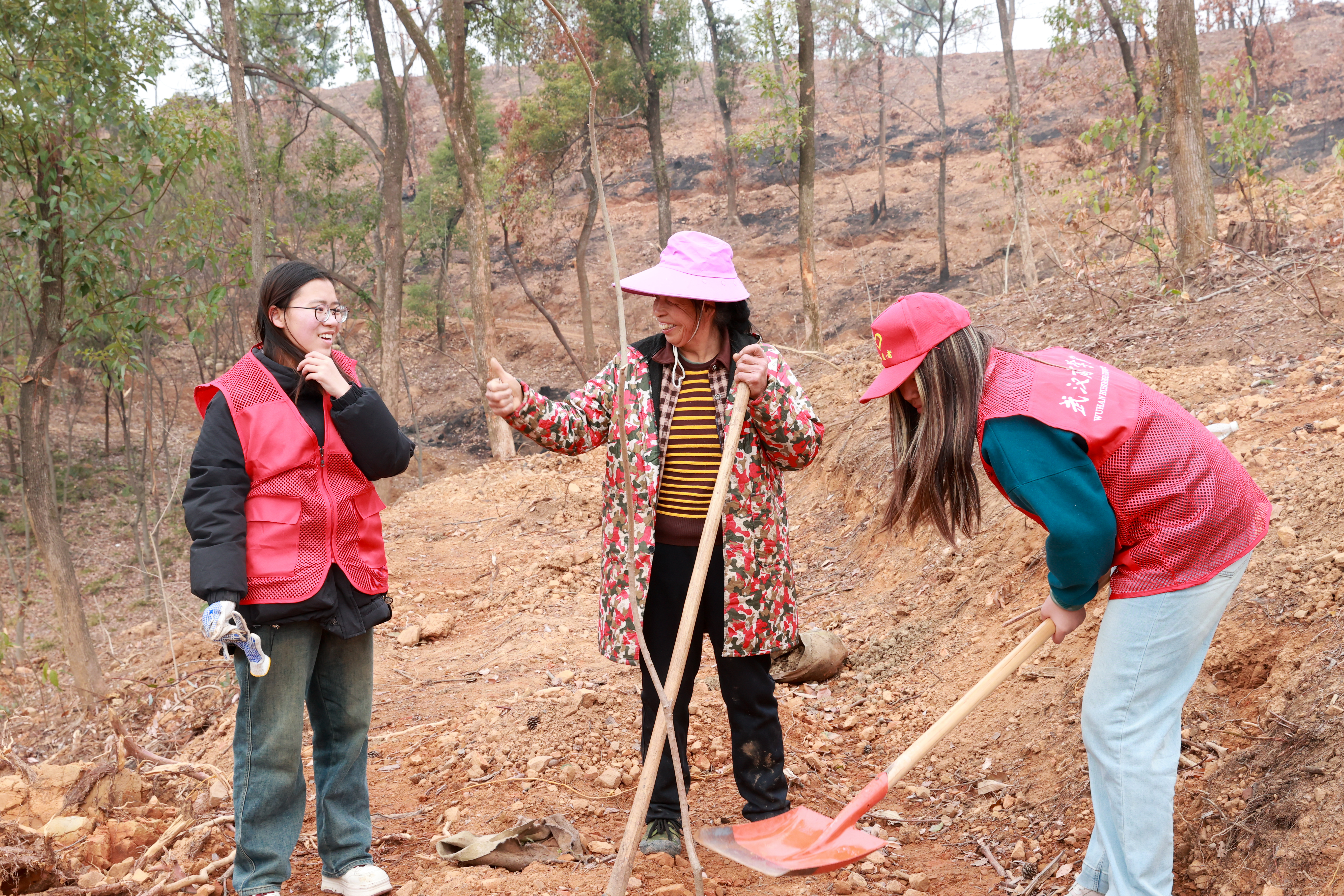 志愿者们自由分成几个小组,每个小组拿着一把铁锹和一棵小树苗来到提前挖好的坑前准备植树。“虽然坑已经挖好了,但是还需要再深挖一下,里面有很多石块比较难挖,多亏了当地阿姨们拿锄头帮我们一起完成。”当地的两位女同志拿着锄头穿梭在志愿者们的树苗间,帮助他们一起完成挖坑、栽树、填坑,一系列动作行云流水,大大提高了志愿者们植树的效率。“填平之后还要用土在树苗的周围围起来,这样‘中间低、四周高’的树坑便于浇水后储水。”在帮助志愿者们的同时,一位女同志还细心地向大家分享了植树的小技巧。