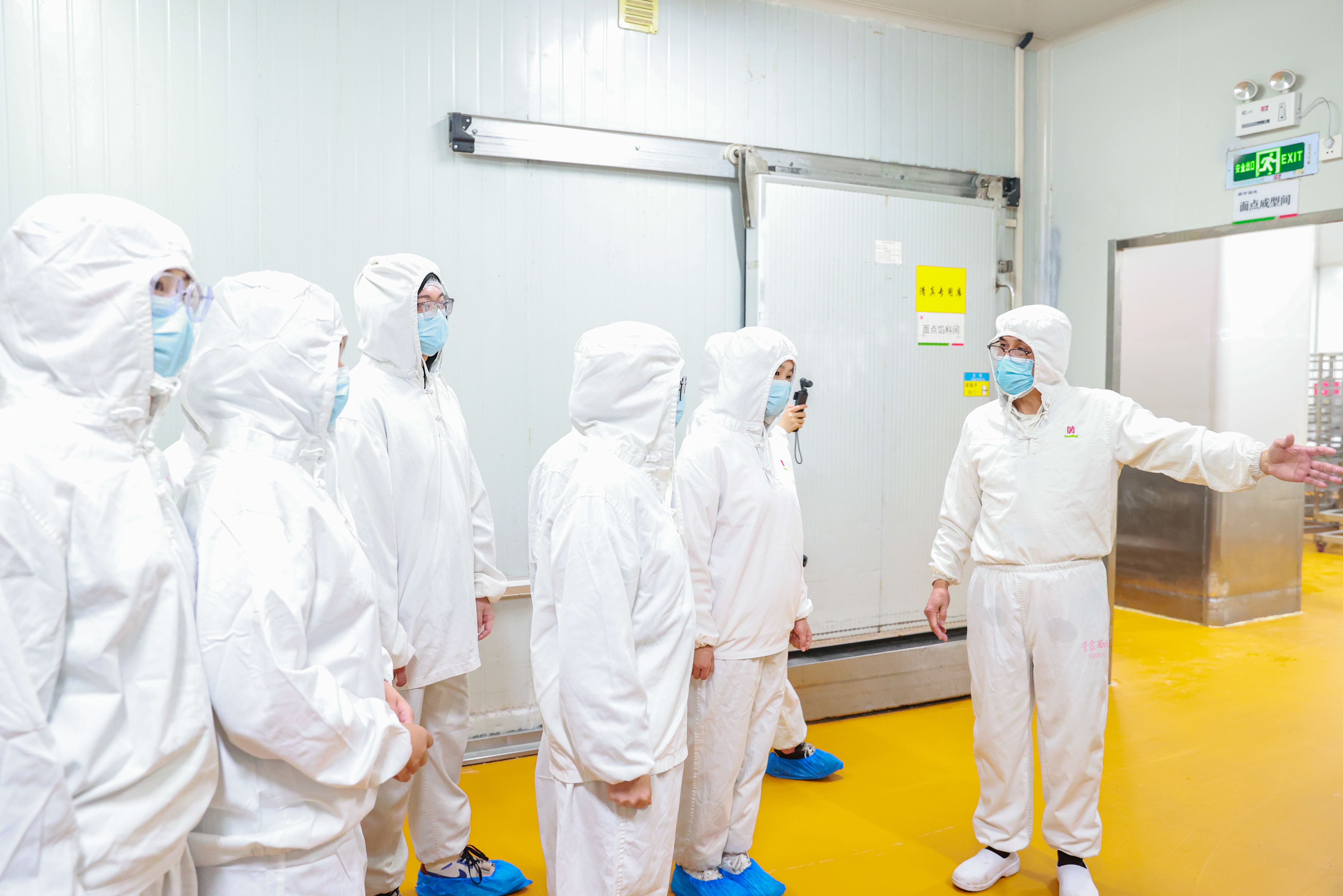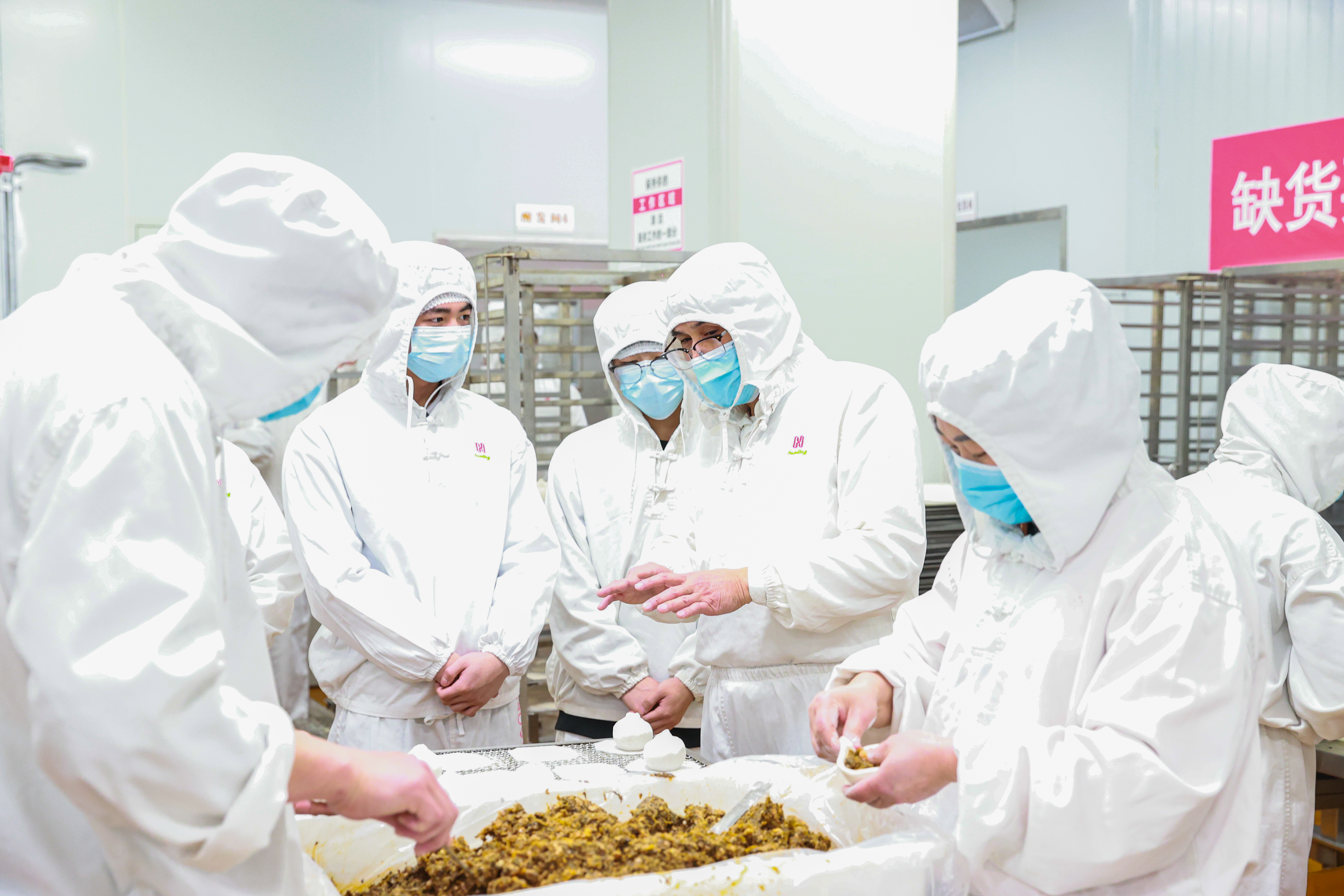 一个包子的标准是什么?在湖北华鼎团膳管理股份有限公司的面点加工间里,80g的包子皮儿由全自动机器自主生产,六比四的皮馅比包子要经过精确称重才能放入成品盘、包子的醒发时间要根据季节来量身定制。“对于订单,我们当天接、当天做、当天发。”华鼎团膳面点烘焙负责人赖晁洋正为食品科技学院大一学生仔细讲解。第一次来到这样的操作间,很多还未接触过实操环节的学生十分好奇,听得也十分仔细。赖晁洋介绍,包子的标准化生产和个性化定制,为人们的生活提供了更多便利和可能。“针对不同企业面对的群体不同,我们也可以调整皮馅比。”赖晁洋带着学生从面点加工间走出,左手就是食品打包发货的物流口。