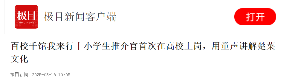 “百校千馆”平台是由湖北省委宣传部、省委网信办、省委教育工委、省教育厅统筹指导,依托极目新闻建设的湖北省“大思政课”实践教学平台。点击“极目新闻”微信公众号底部菜单栏“百校千馆”,可进入“百校千馆”平台,免费预约湖北省各类场馆。