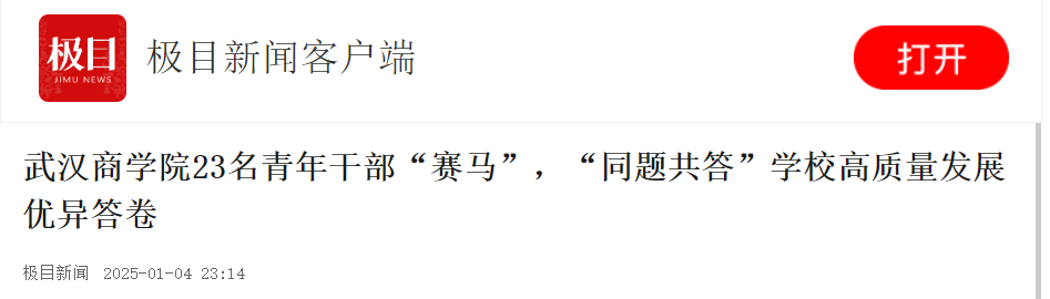 内涵式教学如何推动、“接地气”科研如何突破、人才培养如何更有特色……“赛马”台上,23位来自不同岗位的青年干部结合工作实际,聚焦学校一流应用型商科城市大学建设共同答题,为学校如何在武汉、湖北经济社会发展中展示新担当、作出新贡献建言献策。