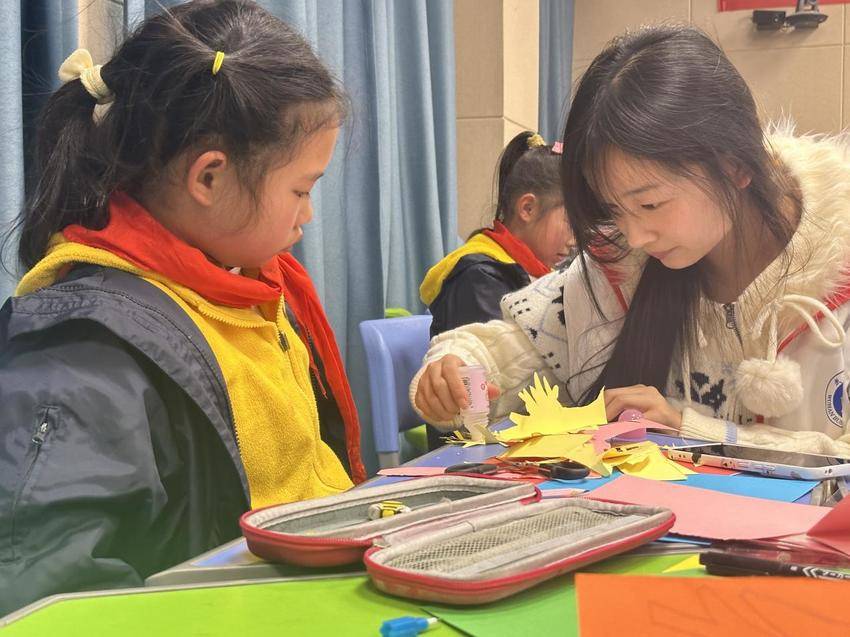活动伊始,志愿者们带领孩子们用彩纸折叠“立体树”。在轻柔的音乐声中,孩子们跟随指导耐心折叠、拼接,逐渐将平面的纸张变成一棵棵生机勃勃的“春日之树”。