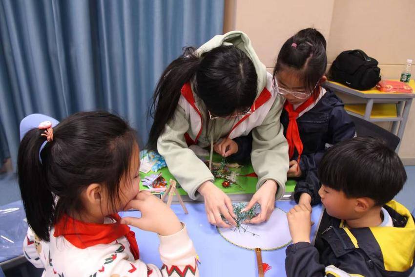 随后,志愿者们与孩子们共同制作千花团扇。孩子们挑选干花、搭配色彩,在扇面上绘制春日图景。志愿者们适时引导:“每一笔都是对春天的诠释,每一扇都是独一无二的艺术品。”活动现场,孩子们挥洒创意,将传统文化与现代审美融合,用团扇传递对春天的热爱。