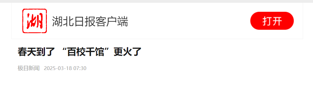 “百校千馆”平台是由湖北省委宣传部、网信办、教育工委和省教育厅统筹指导,依托极目新闻建设的湖北省“大思政课”实践教学平台。广大市民朋友可关注极目新闻微信公众号,点击底部菜单栏“百校千馆”,即可免费预约参观湖北省各类场馆。
