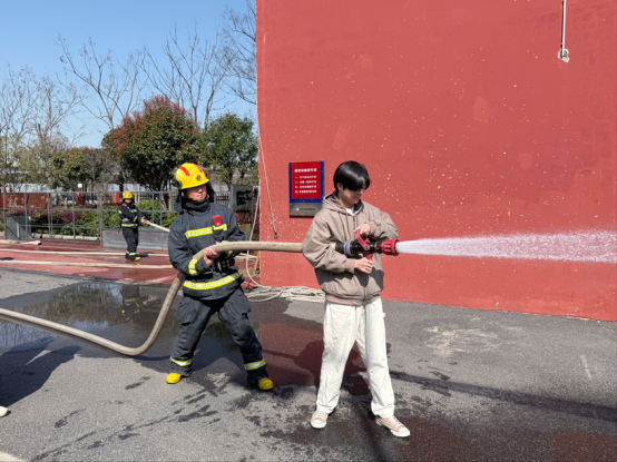 在消防员的带领下,同学们参观了消防站的各类救援设备,详细了解了消防救援的全过程以及消防员日常高强度的训练方式,深刻体会到消防工作的严谨与不易。在消防员指导下,学生们系好安全带分批登上消防云梯车,体验高空救援场景。“升到十几米时心跳加速,但想到消防员要扛着装备在更高处作业,由衷敬佩!”2024级学生雷欣然在体验后表示。实操环节中,大家分组进行了水枪操作体验。从水带连接到喷水灭火,参与者们认真学习每一个动作要领。看似简单的水枪操作,实际需要很强的体力和技巧。