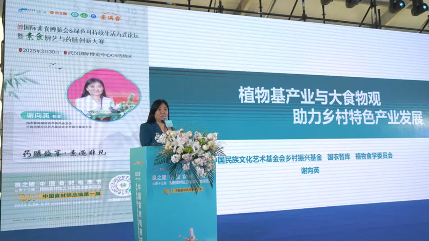 中国民族文化艺术基金会乡村振兴基金、科学艺术基金主任、国农智库、植物食学委员会谢向英主任(中国农工民主党中央文化体育艺术工作委员会副主任、秘书长,农工党北京市委会妇女工作委员会副主任,秘书长),作了题为《植物基产业与大食物观 助力乡村特色产业发展》的主题报告。从全球视野解读大食物观,提出植物蛋白革命将重塑5万亿餐饮市场格局的判断,并就植物基产业与乡村振兴、特色产业发展提出思路与个人见解。