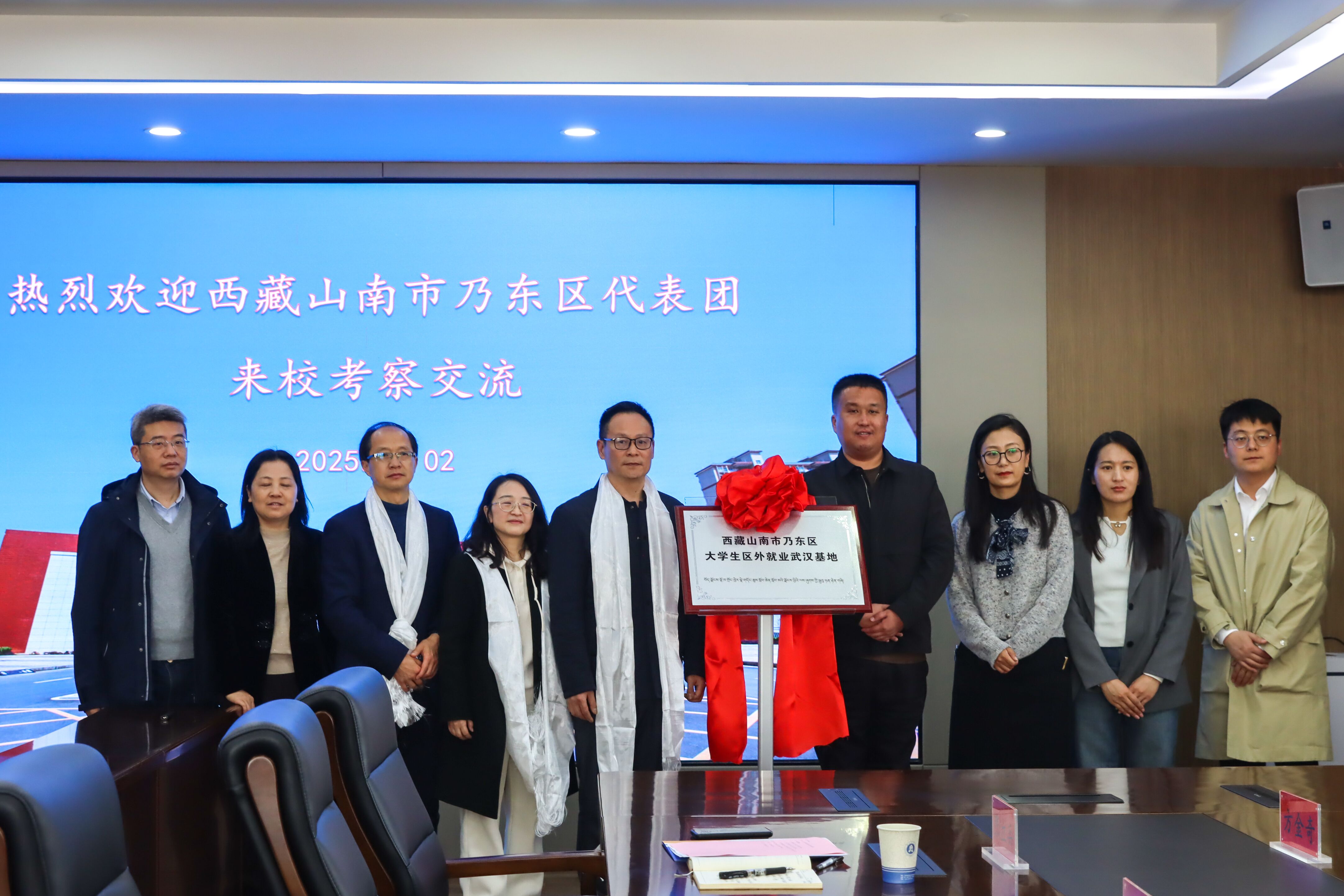 本网讯 4月2日,西藏山南市乃东区政府代表团来访调研座谈会在必赢官网行政楼508会议室召开,就深化校地合作进行交流探讨。副校长罗双燕与乃东区政府副区长邓文彬共同完成“西藏山南市乃东区大学生区外就业武汉基地”揭牌仪式。党委组织部、党委学生工作部、旅游管理学院、继续教育学院等相关部门参会。