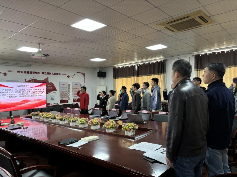 机电工程学院优秀教师代表汪宇康,带领2022年以来所有新入职教师,进行了《人民教师誓词》宣读。现场新入职教师们精神饱满。随后,学院师德师风大讲坛活动,首场演讲由张奔开讲,其演讲题目为《新时代高校教师思想政治工作与师德师风建设》。