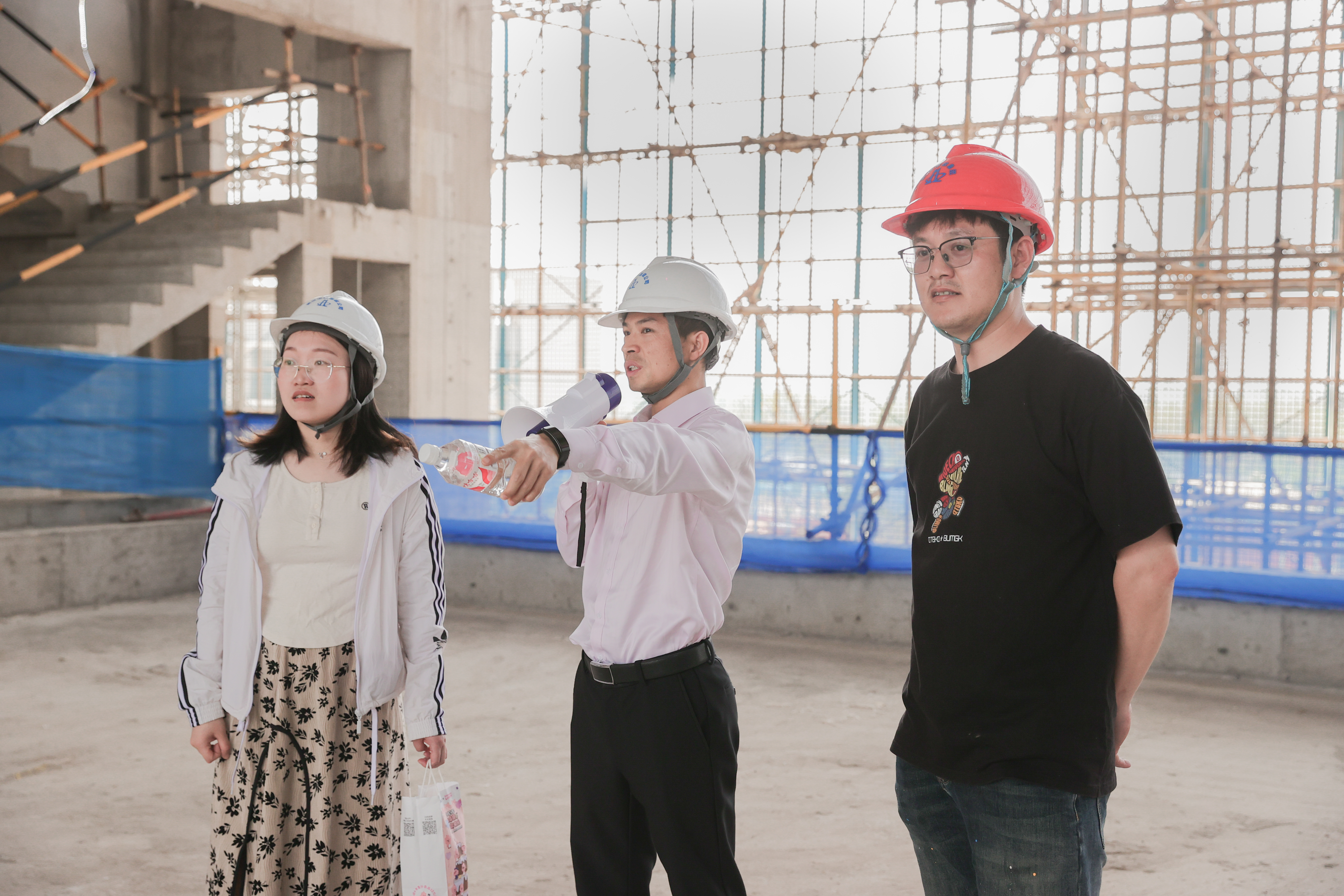 随后,安全总监曹纲带领老师们前往图书馆的施工现场。曹纲介绍,图书馆可容纳50余万册书籍,并配备有交流中心和会议室,竭力满足师生学习与研究的需要。体育馆及操场设施完备,配有室内篮球场。即便在下雨天也能满足体育课程需求。