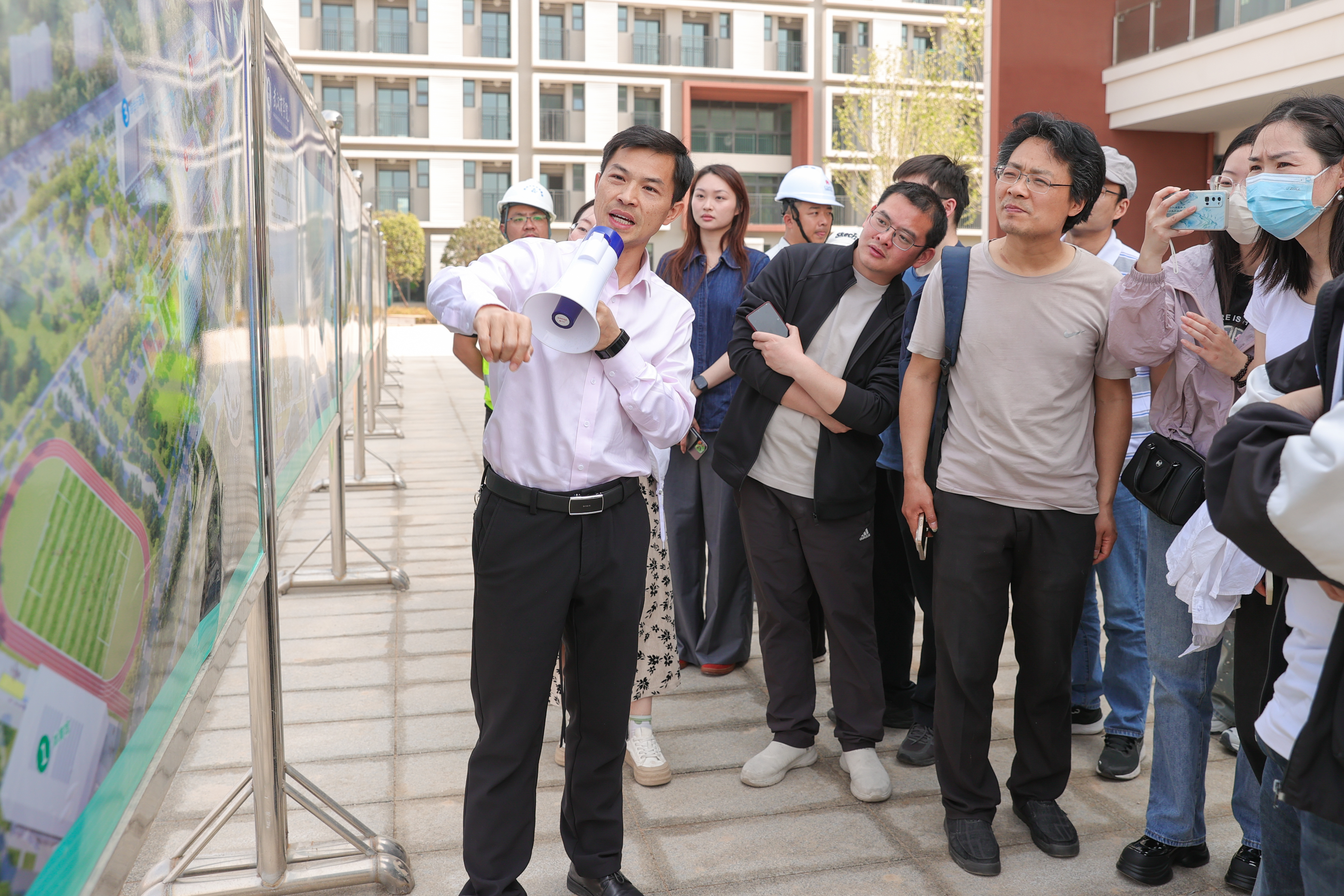 后勤与基建管理处教师夏文才带领老师们参观食堂、学生宿舍、人才公寓、图书馆、体育馆、实验室等新校区亮点建筑。新校区由三期工程组成,目前已经到了三期阶段,预计于2026年年底完工。