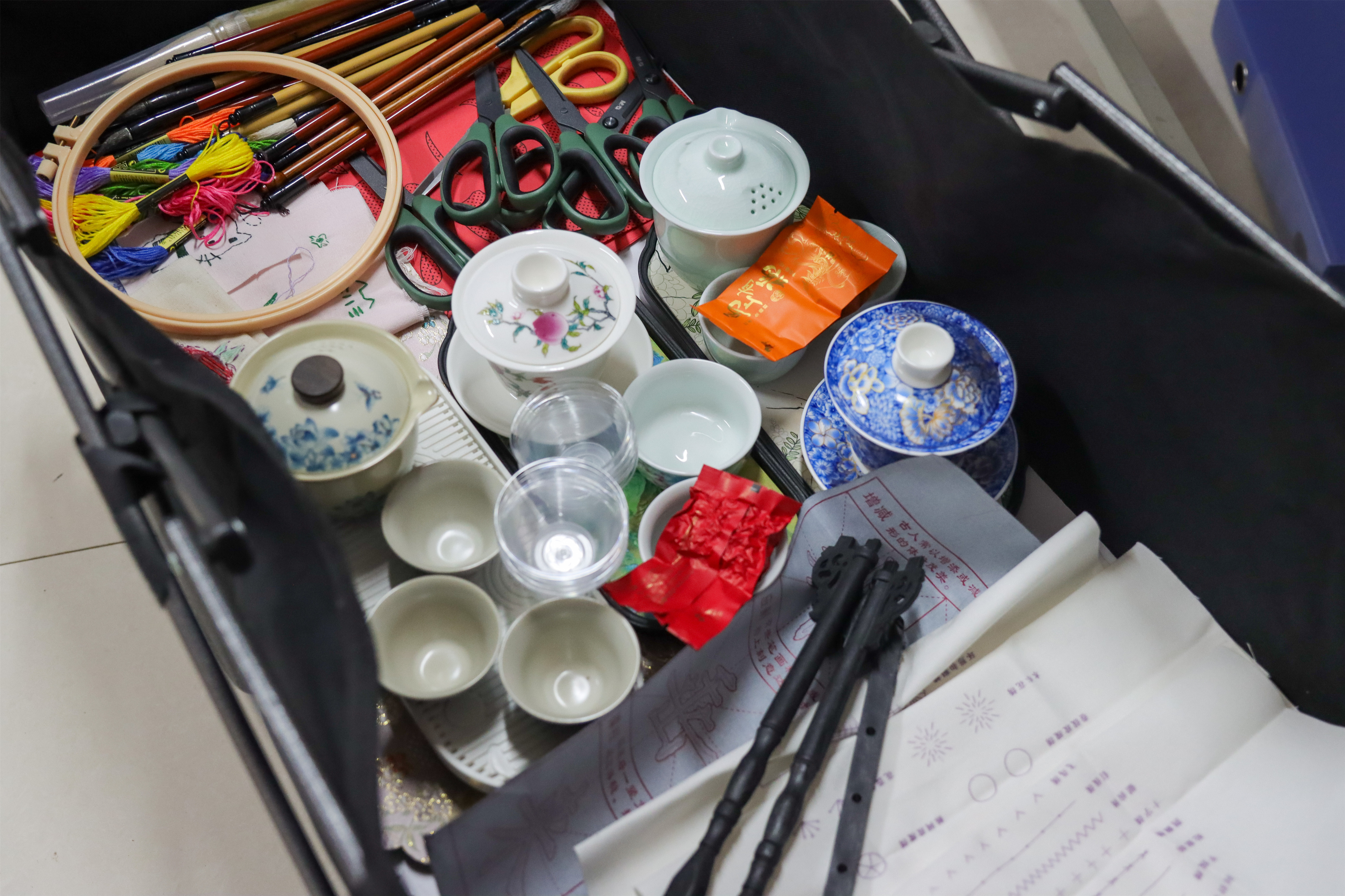 外国语学院《中国文化概论》的课堂,是翻译专业学生的“心头爱”。2020年开设这门课以来,为了让学生更好地感悟课程魅力,唐金凤把实践环节融入课程教学,攒出了一个“百宝箱”:60多张剪纸图样、10几把剪刀、3套茶具、20多支毛笔……满满一箱极具中国传统文化特色的“宝贝”,是唐金凤自费为学生购买的教具。