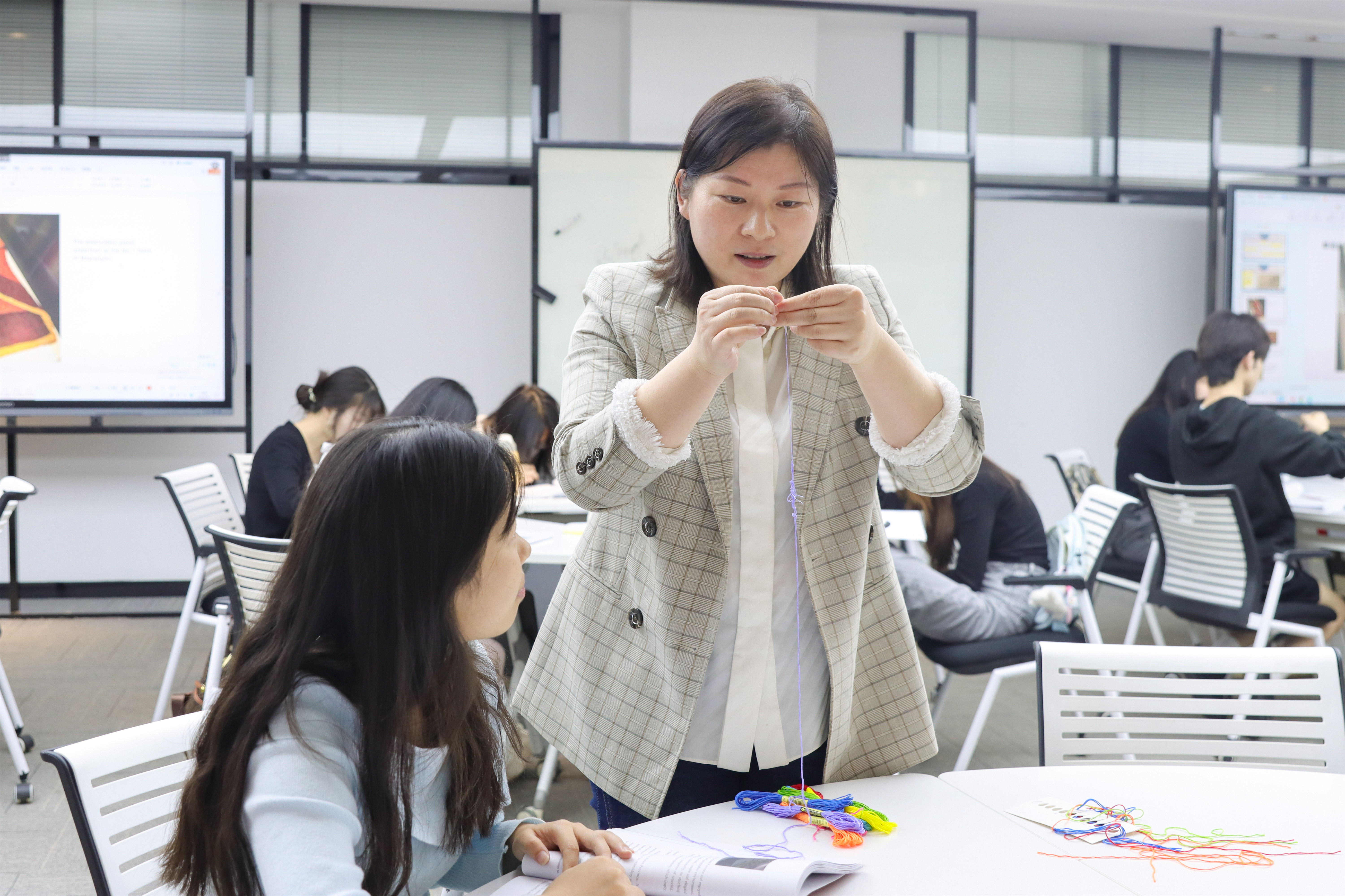 本网讯 “居然还有刺绣,这门课真是乐趣无穷!”4月14日下午,在北四215智慧教室里的英语课,映入眼帘的不是常见的英语教材和练习册,学生拿着针和绣线在布料上绣着小兔子、雪花等图案,授课教师唐金凤一边看着学生们的成果,一边将课程里刺绣的内容用英语进行讲解。