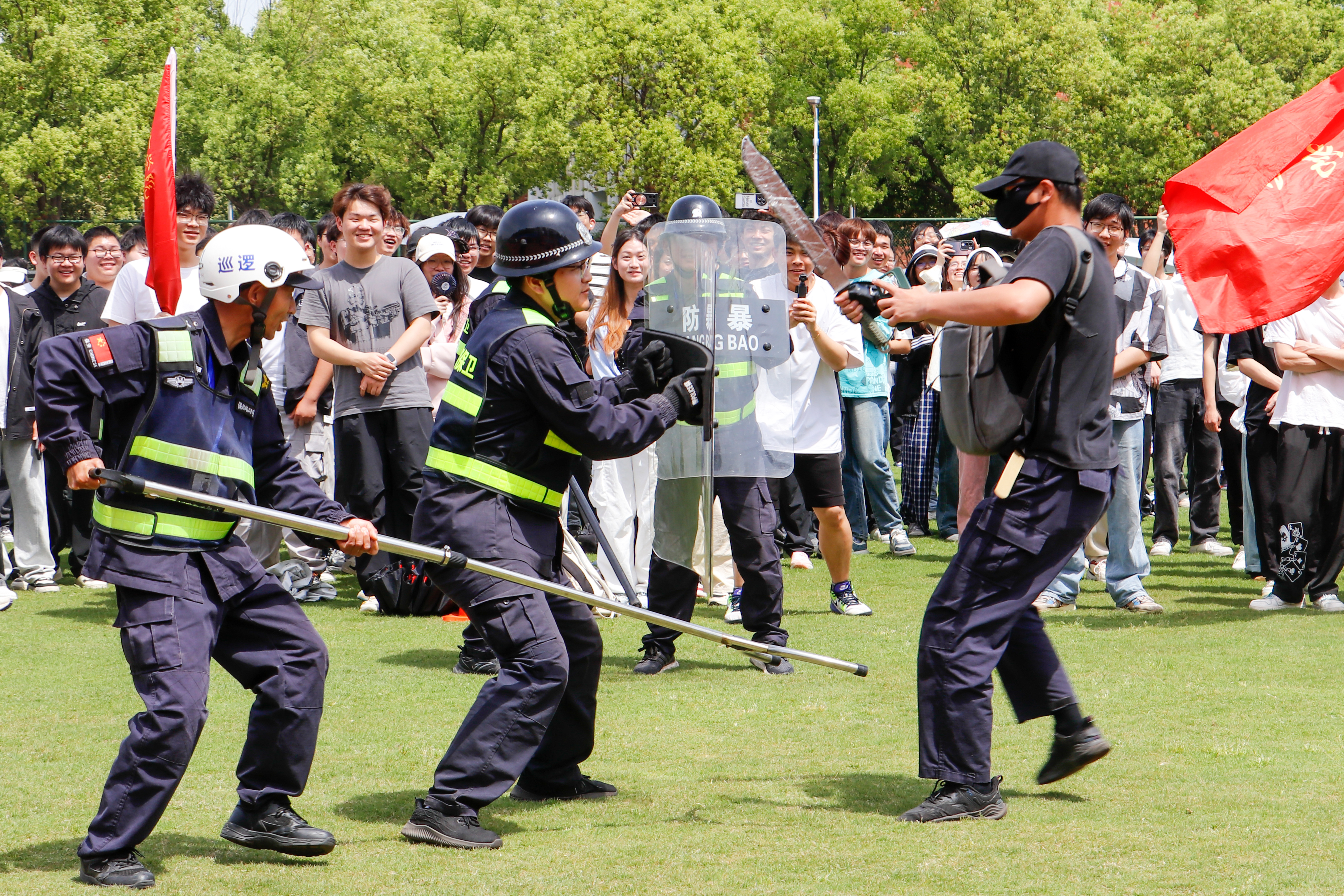 保卫处为同学们带来精彩防暴表演。歹徒出现时,保卫处员工立即成立反恐防暴小组,使用专用工具将歹徒制服。