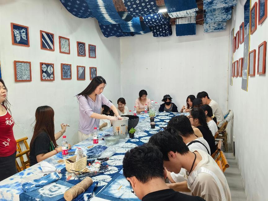 在参观了沼山村古村落的美丽环境后,同学一行去当地非遗文化草木扎染开展了体验活动,学生说:“当布料缓缓展开之前,就像拆开盲盒一样带着惊喜”。带队教师王瞻说:“读万卷书,行万里路,希望大家珍惜这一次的旅程,从美丽乡村的改变中感悟时代进步的力量,未来去祖国需要的地方奉献自己的才智”。此外,本次活动由22级退役大学生杨超、李长乐担任活动的安全员和团建活动的教官,带领学生开展破冰游戏、徒步拓展等活动,发挥了退役大学生的朋辈引导作用,也加强了学生的凝聚力,共同诠释了成长共同体理念。