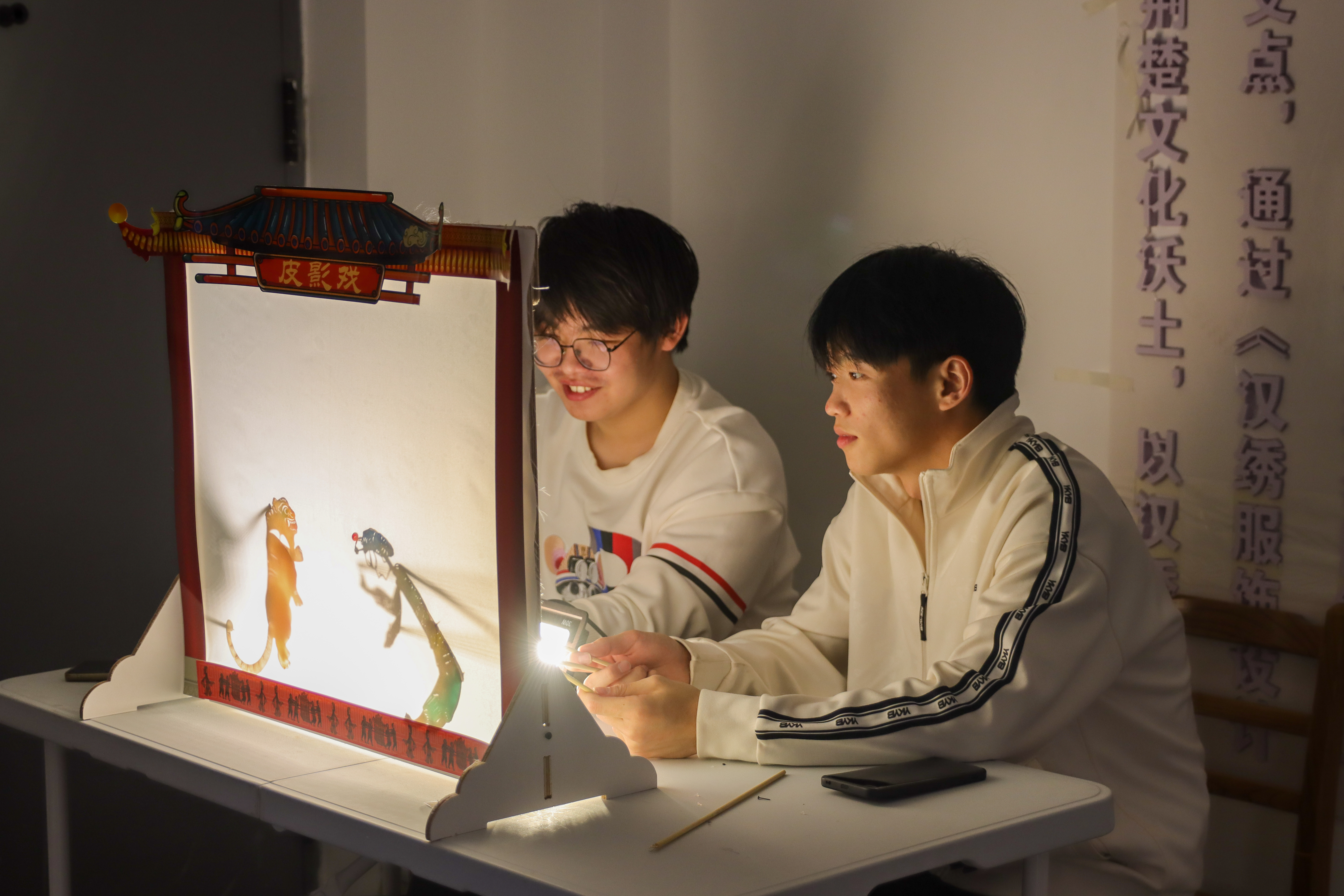 4月20日的拍摄现场笑料不断。在《三顾茅庐》剧组,学生用纸板搭建“茅草屋”,皮影“诸葛亮”摇着扇子念出改编台词;《西游记》剧组上,皮影“猪八戒”挥着耙子、摸肚大笑的形态栩栩如生;《武松打虎》里,灵活自然的皮影“武松”勇敢无畏大战猛虎,仿佛跃然皮上……