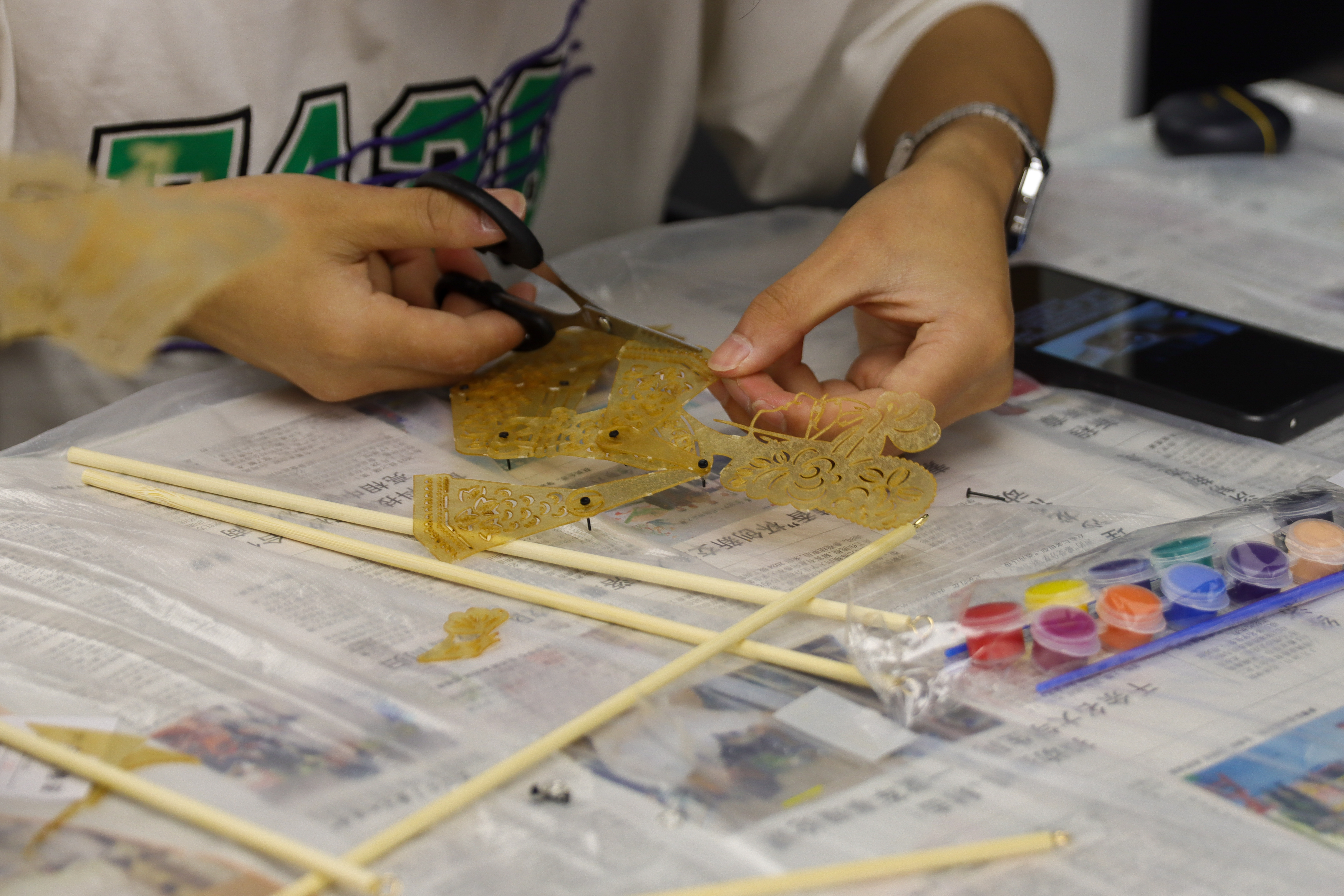 当传统技艺遇上新时代脑洞,会摩擦出怎样的火花呢?“我们组抽到了‘三打白骨精’,白骨精的服装能不能加点暗黑系元素?”4月18日,活动伊始,三十个小组通过抽签选定《西游记》《三国演义》等经典主题后,立即投入“头脑风暴”模式。制作现场上,有的同学使用特制的矿物颜料小心翼翼地用颜料为皮影“上妆”,细腻的笔触勾勒出戏曲人物的眉眼;有的则专注拼接竹竿与操纵杆,让皮影的关节灵活舞动。“没想到看似简单的皮影,制作起来竟有这么多门道!”2023级食品科技学院的邓城希感叹说。