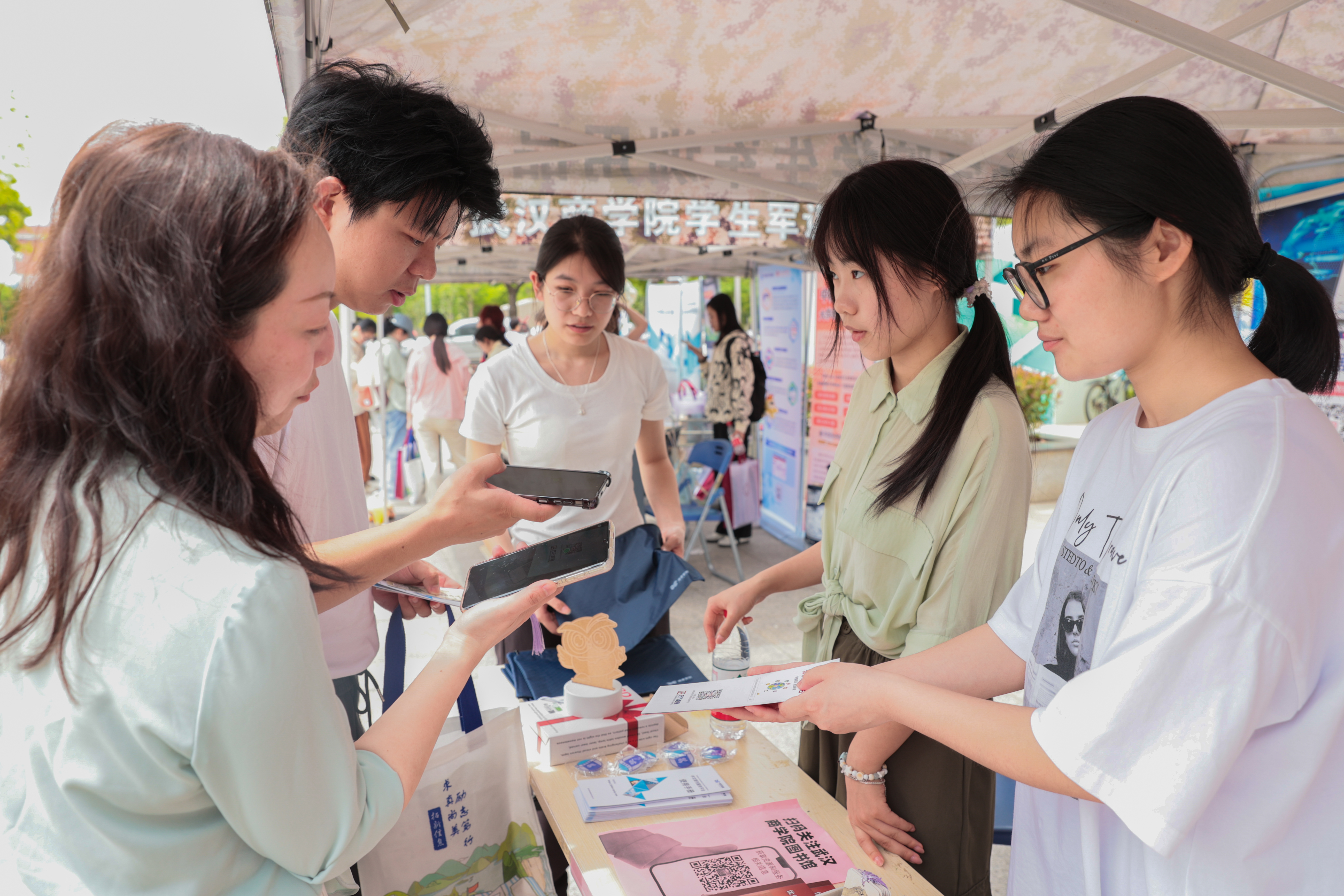 其中博看网的展位充满了文艺气息,他们展示了丰富的期刊、图书资源,吸引了不少师生驻足。工作人员介绍说:“在这里,您不仅能阅读到国内外知名的文学期刊,还能参与我们线上的读书分享会,和全国各地的读者交流阅读心得。”说着,便邀请一位同学现场扫码体验,同学进入阅读界面后,惊喜地发现里面有自己一直想读却没找到的书籍。