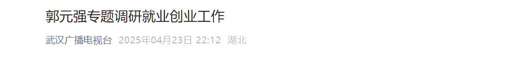 4月23日,省委常委、市委书记郭元强前往青年创业园、人力资源服务机构、高校调研就业创业工作。他强调,要深入学习贯彻习近平总书记关于就业创业工作的重要指示精神,深入实施就业优先战略,健全完善就业创业支持服务体系,大力支持高校毕业生等广大青年在汉创新创业,更好推动以创新创业带动高质量充分就业