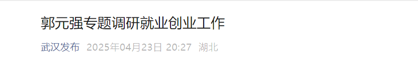 4月23日,省委常委、市委书记郭元强前往青年创业园、人力资源服务机构、高校调研就业创业工作。他强调,要深入学习贯彻习近平总书记关于就业创业工作的重要指示精神,深入实施就业优先战略,健全完善就业创业支持服务体系,大力支持高校毕业生等广大青年在汉创新创业,更好推动以创新创业带动高质量充分就业。