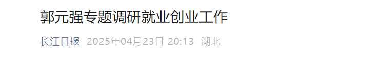 4月23日,省委常委、市委书记郭元强前往青年创业园、人力资源服务机构、高校调研就业创业工作。他强调,要深入学习贯彻习近平总书记关于就业创业工作的重要指示精神,深入实施就业优先战略,健全完善就业创业支持服务体系,大力支持高校毕业生等广大青年在汉创新创业,更好推动以创新创业带动高质量充分就业。