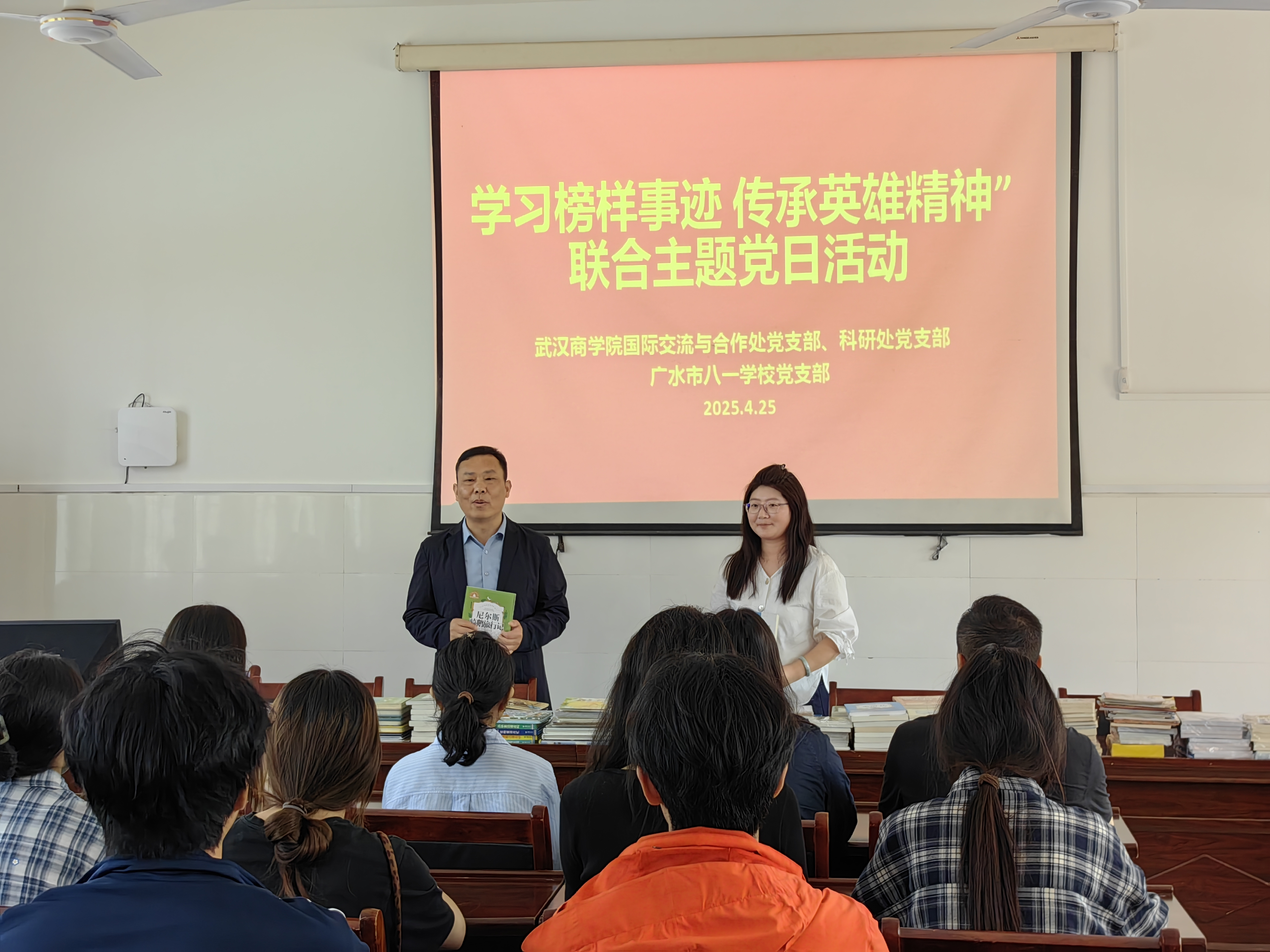 为深入学习贯彻党的二十大精神,赓续红色血脉,强化党性教育,4月25日上午,国际处党支部、科研处党支部与广水市八一学校开展“学习榜样事迹 传承英雄精神”联合主题党日活动,通过参观黄继光纪念馆、党建带团建、“大手牵小手”志愿服务活动、捐赠图书和学习用品等活动,进行沉浸式教育,进一步坚定理想信念,传承红色基因,凝聚奋进力量。国际处党支部、科研处党支部全体党员教师、国际教育学院学生入党积极分子、广水市八一学校吴校长及党员教师参加活动。