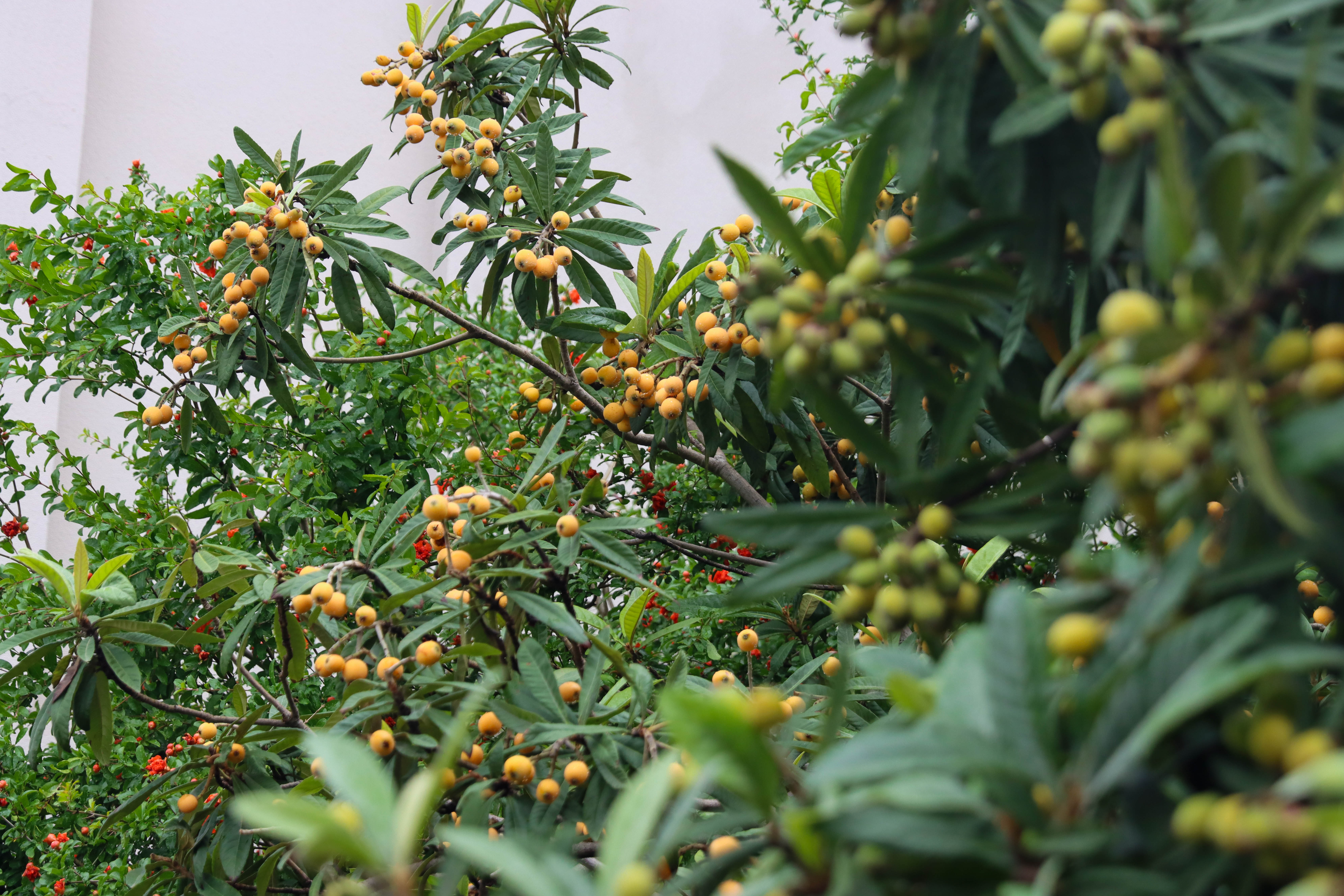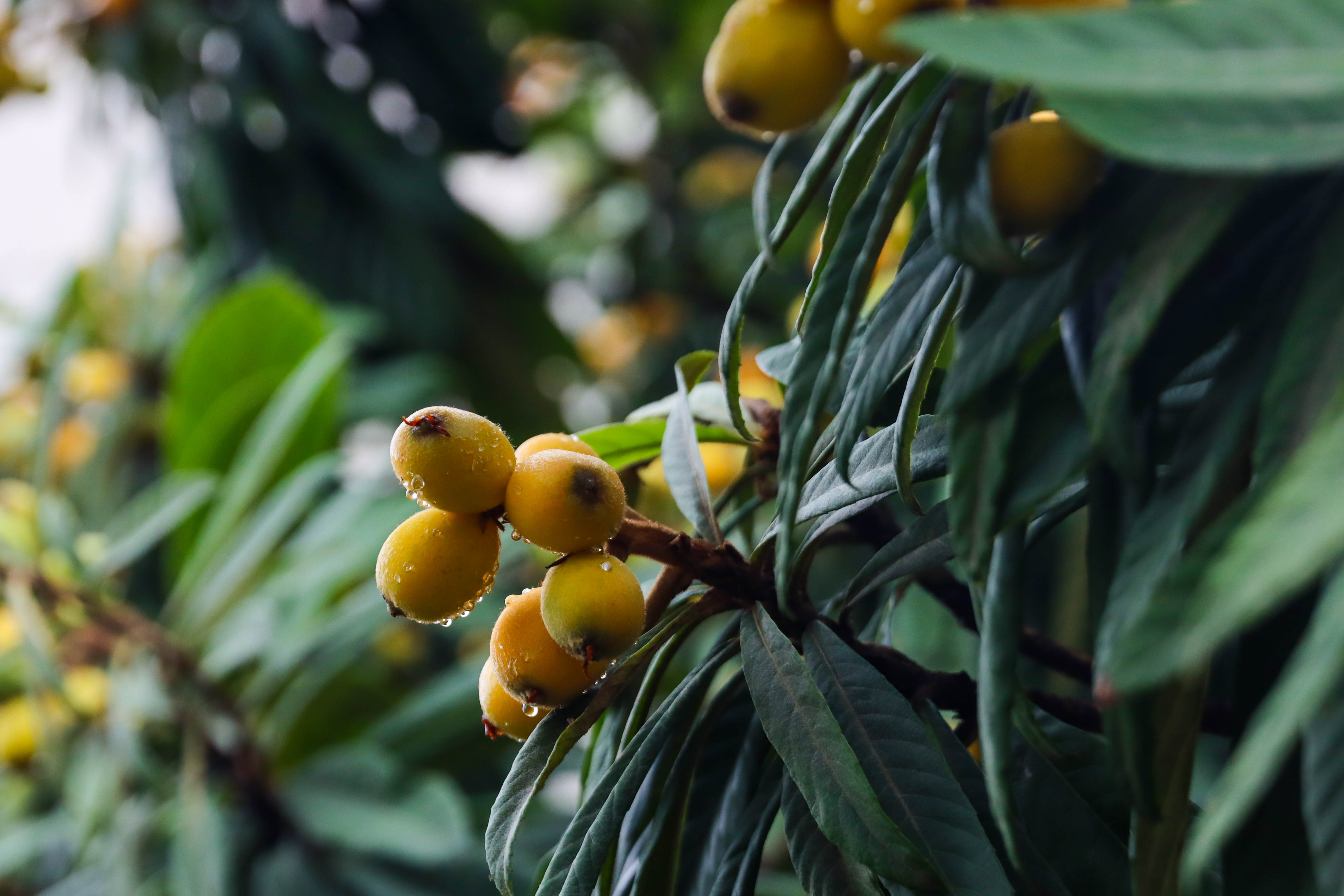 初夏的季节里,枇杷还未完全熟透,直到五月的风吹过,将枝头的青果渡上了金边。青果和金果互相交错,乒乓球大小的果子们成簇垂落在枝头,表皮附着着浅浅绒毛,在绿叶中若隐若现。起初只是零星几点黄色,羞涩的少女拎起黄色的裙摆藏于茂盛的绿叶之中。渐渐那抹黄色固执而又缓慢地向上攀爬,从果蒂再到整个果实,在不知不觉间开始和绿色分庭抗礼。