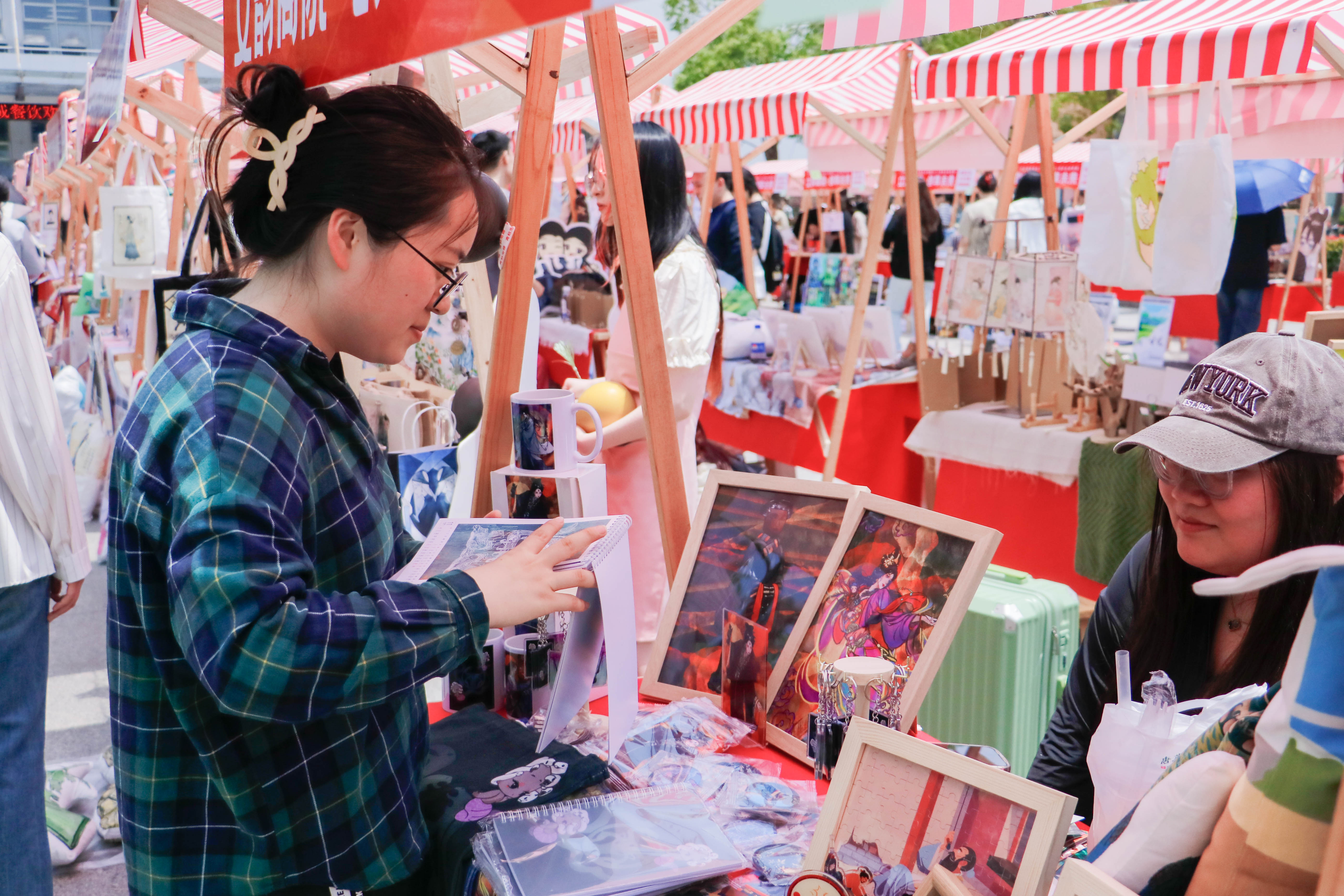 《青绿之间》展台,蓝白交织的扎染作品被精心陈列,深浅不一的晕染,起伏的褶皱,都述说着传统扎染工艺与现代时尚设计的美妙邂逅。《溪游记》展台则将文创与乡村振兴紧密相连,武当山贡茶、竹溪魔芋面、房县小花菇……一件件家乡特产被巧妙融入毕业作品。“我想用插画的形式来反映出家乡特产的特色,为乡村振兴的建设注入动力,展现家乡的每一幕新变化。”动画专业毕业生朱漪镝介绍自己的思路。不少摊位前,师生们了解创意背后的故事,现场交易的同时,还可以将自己的想法与“摊主”沟通,预订自己的创意产品。