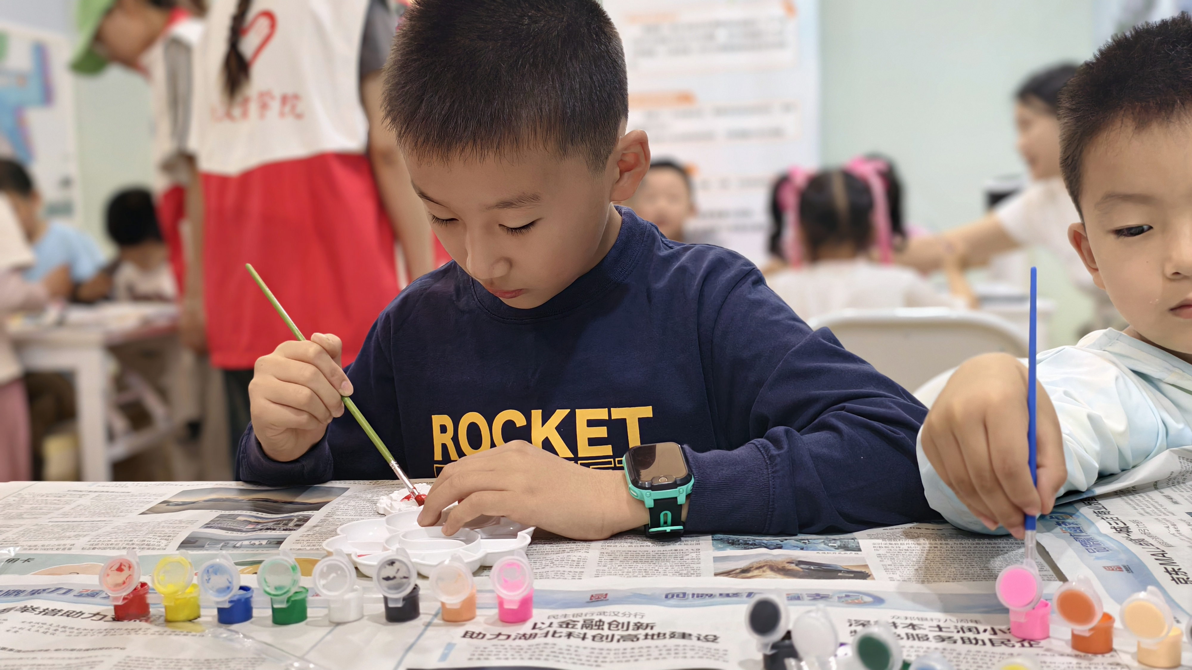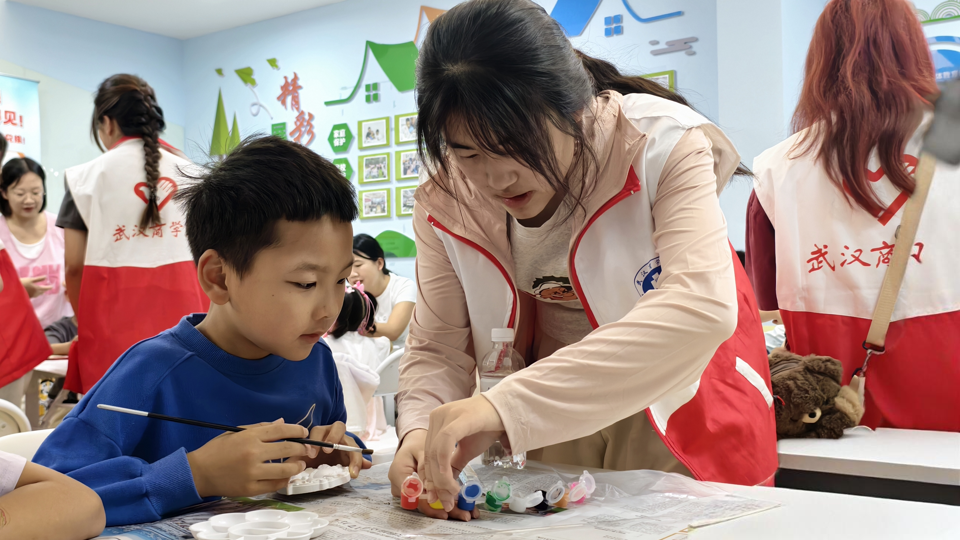 志愿者给小朋友们分配颜料。 学院摄