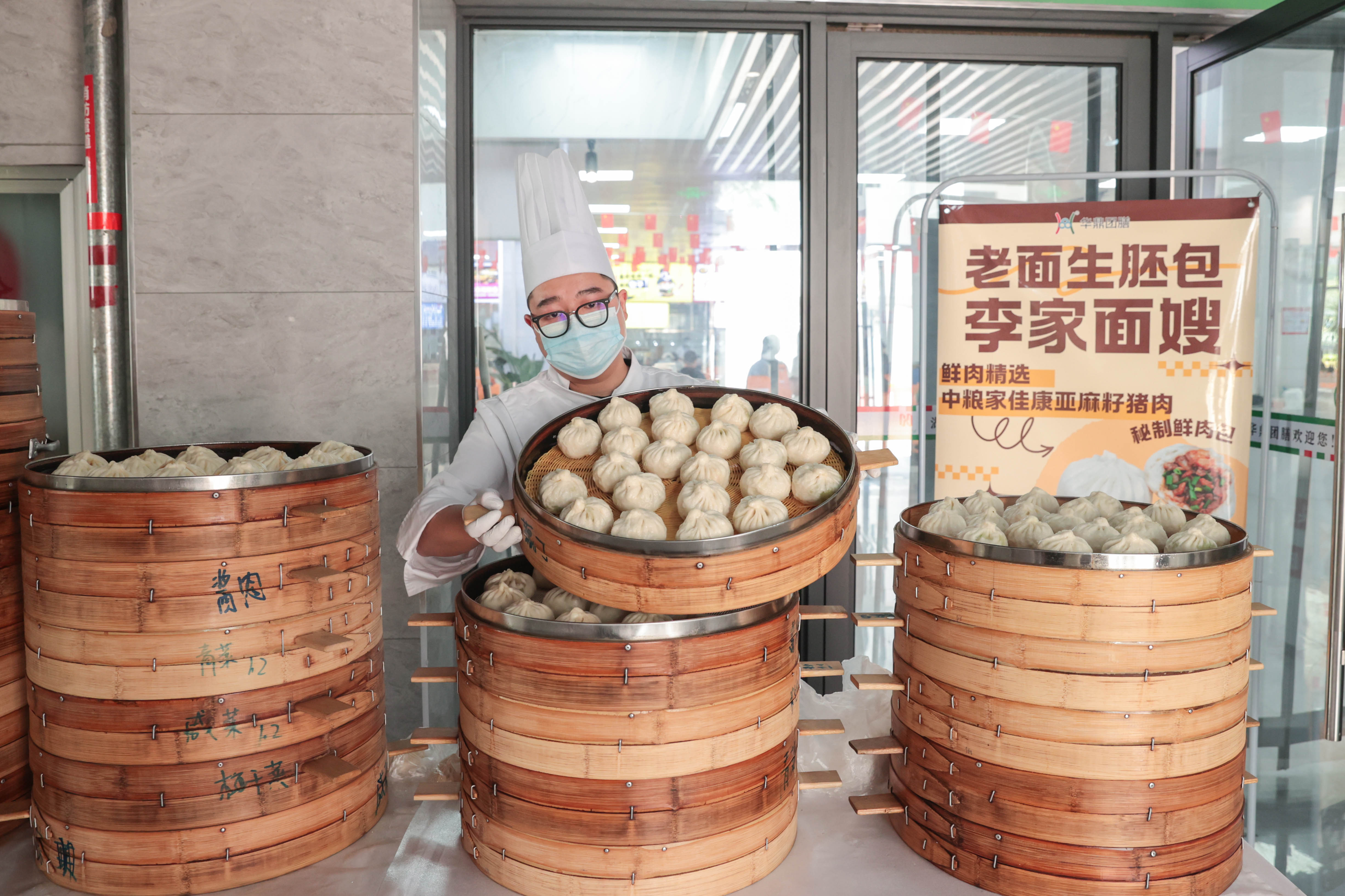 5月12日中午,在南区食堂,猪肉梅干菜、奥尔良鸡肉、青菜包、酱肉包等6个种类的1000个老面包子免费向师生发放,并收集师生意见反馈。