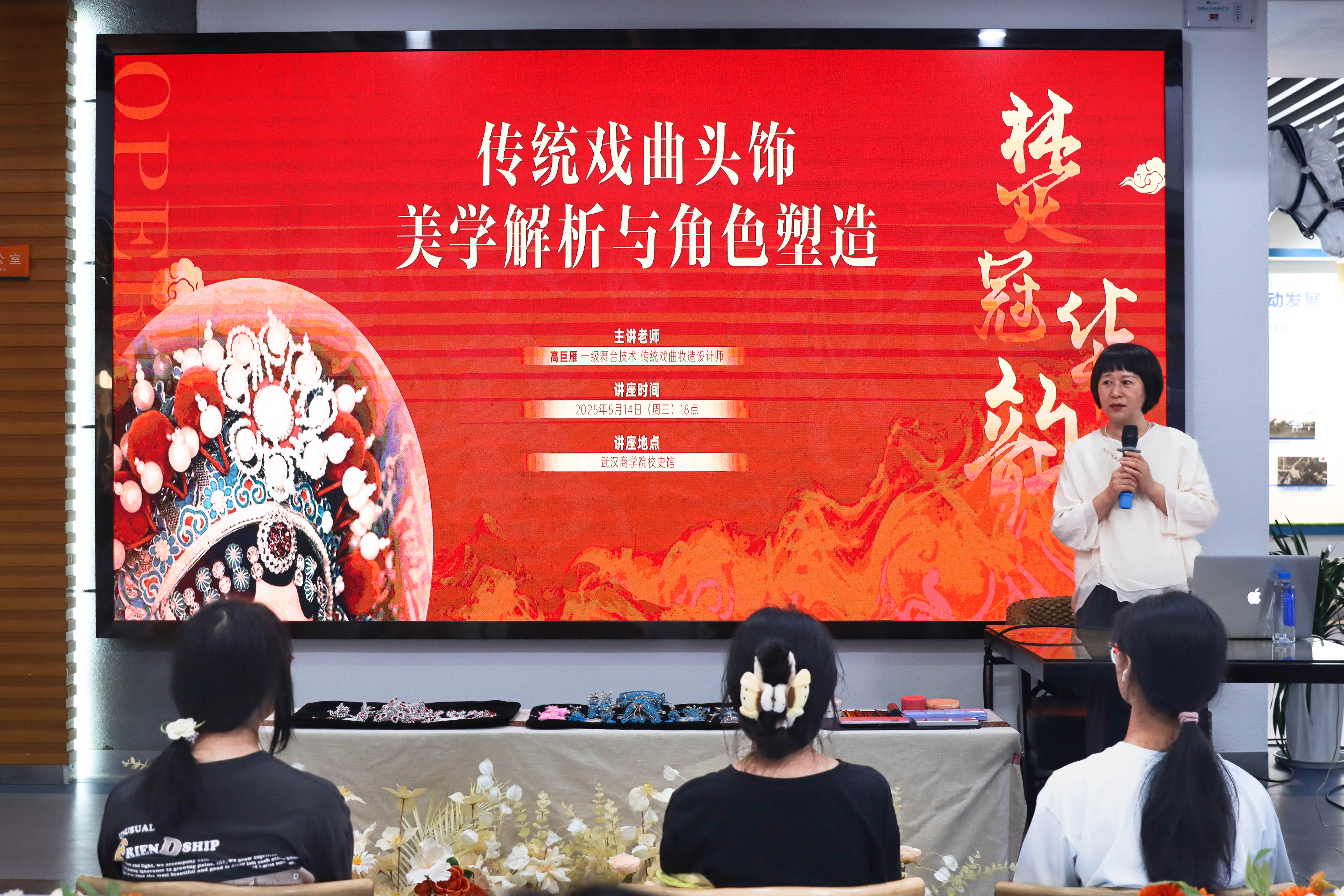 本网讯 “贴片、勾脸、戴头面……”5月14日晚,校史馆内一场别开生面的国学小课让大学生们与传统戏曲妆造面对面。第47期国学小课以“楚冠华韵——传统戏曲头饰美学解析与角色塑造”为主题,邀请湖北省京剧院一级舞台技术专家高巨雁现场授课,通过理论讲解与实战教学相结合的方式,带领学生探索戏曲妆容背后的文化密码。