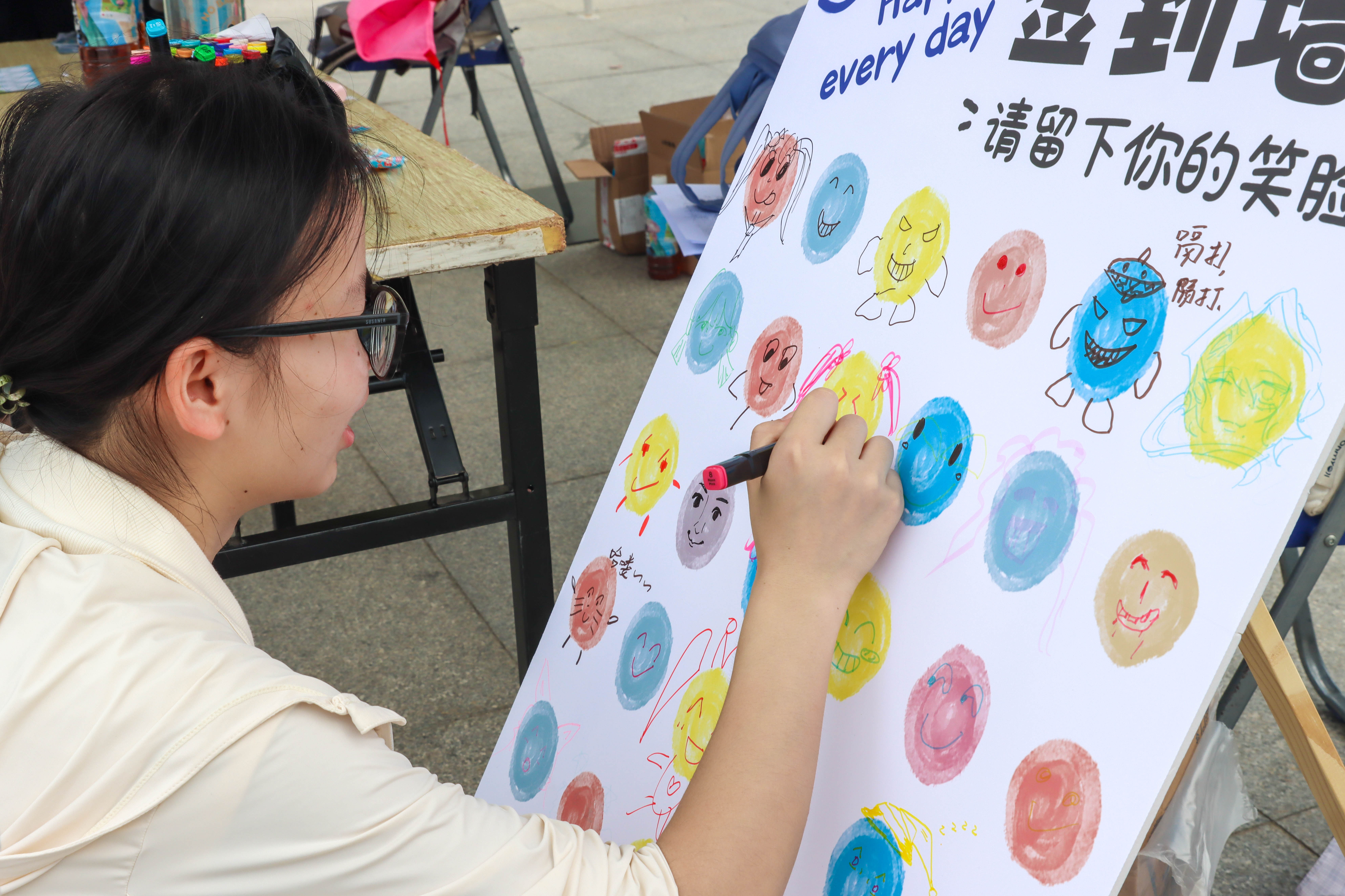踏入活动现场,一张张集章卡,是同学们开启快乐之旅的“通行证”。食品科技学院用“烦恼粉碎机”帮助同学们打开通往内心深处的大门,同学们手持便签,写下烦恼,便可获得印章一枚。将烦恼便签撕碎,看着纷飞的纸屑,仿佛烦恼也随之消散。如果快乐有模样,那一定是笑脸。在国际教育学院与经济学院的展台前,同学们化身“神笔马良”,用彩色画笔勾勒出的每一张灿烂笑脸,都生动地在他们的脸上呈现。“看到自己画的笑脸,感觉心情都跟着明朗起来了,这种快乐是会传染的!”2024级人力资源管理专业二班的汪能蓉说。
